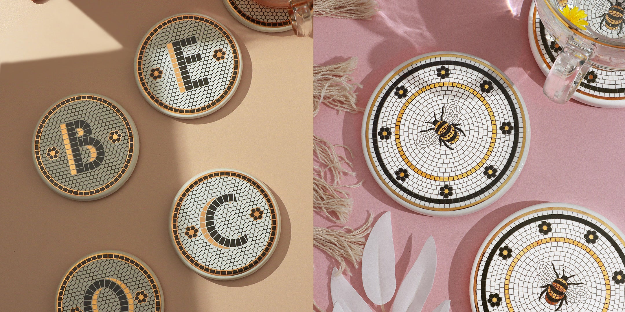 Hand-finished mosaic coasters and table accents — designed to elevate everyday moments with quiet elegance.