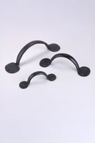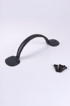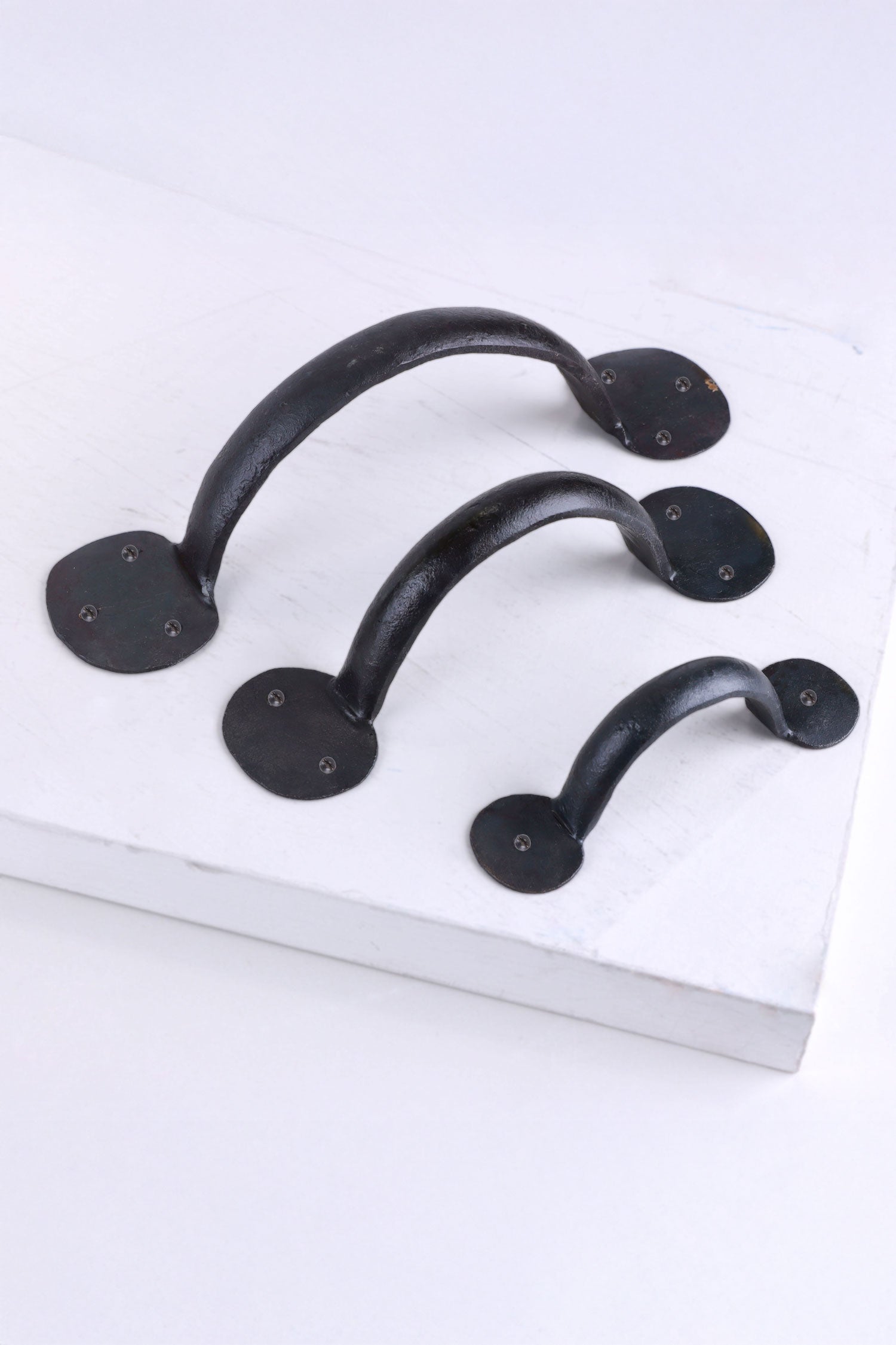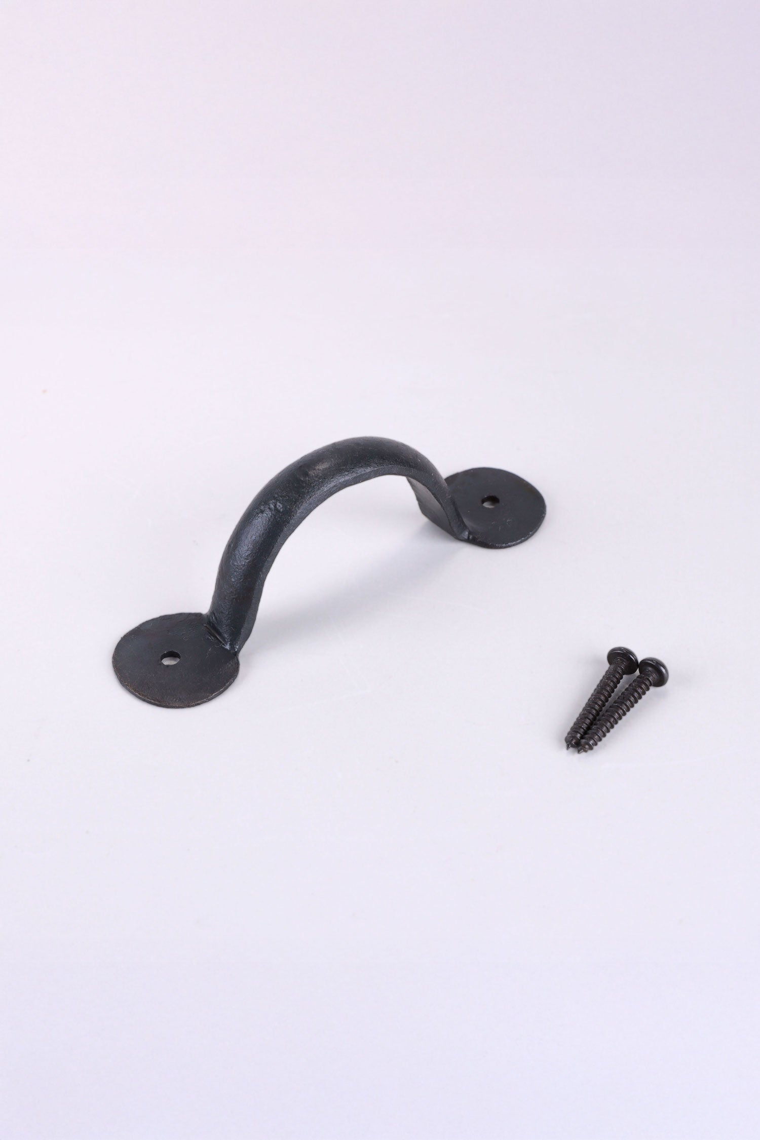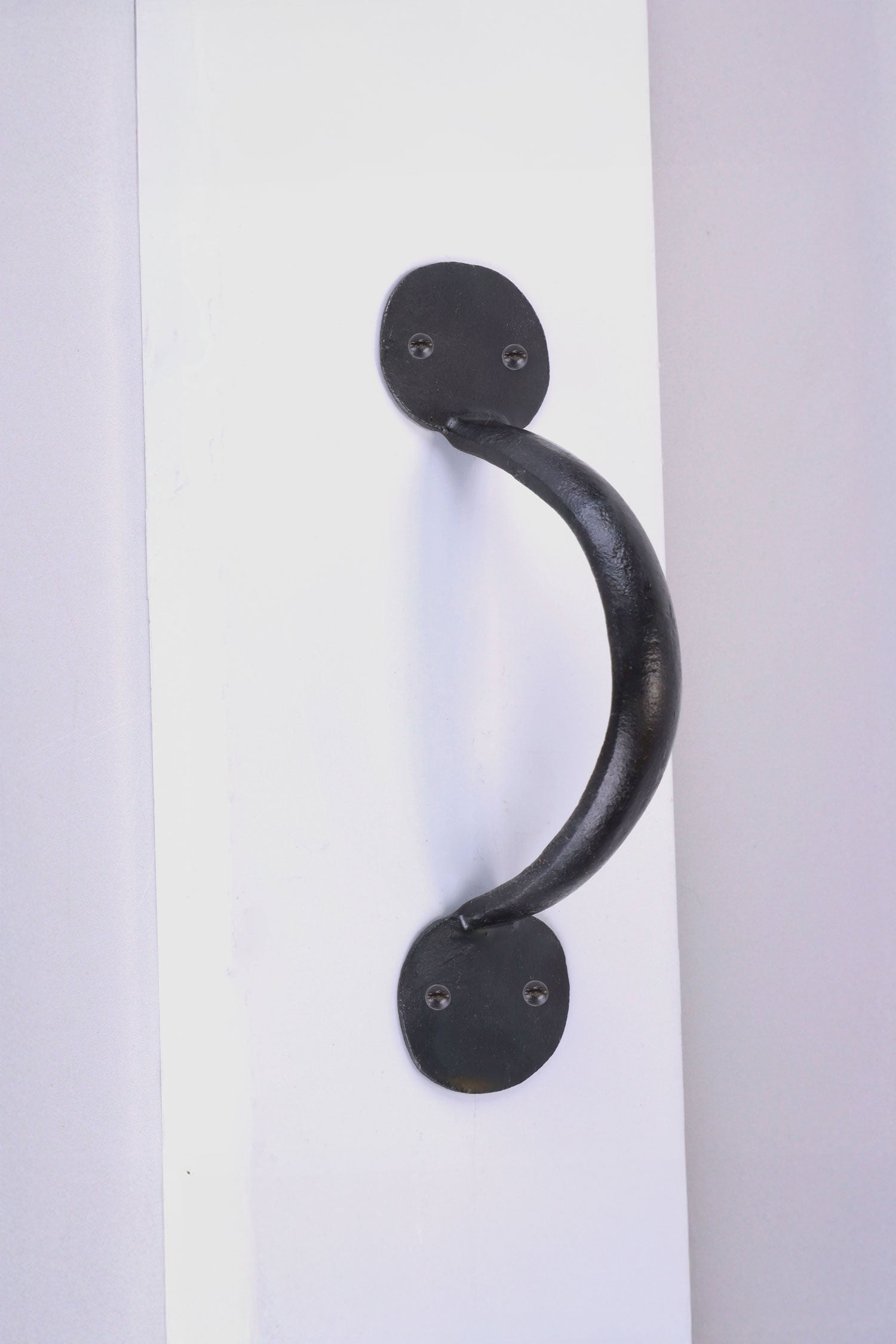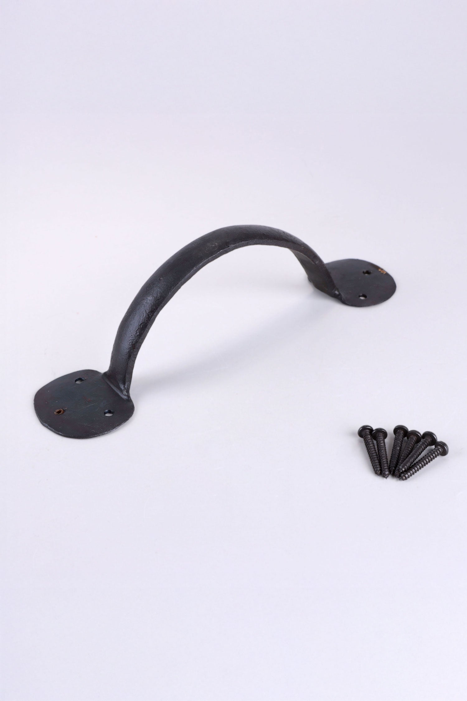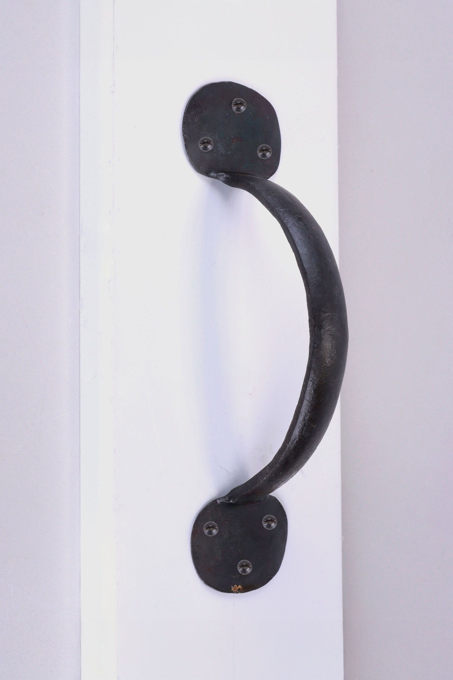 This hand forged coinbase iron pull handle is manufactured using traditional blacksmith techniques and finished with a natural beeswax coating. The handle is forged from solid iron and shaped by hand to create a robust and practical fitting suitable for a wide range of interior applications. The handle is fitted with round coinbase fixing plates at each end. These bases are formed by hammering the iron to create a raised, textured edge around the fixing points, providing both strength and a distinctive traditional appearance. The coinbase detail is a characteristic feature of classic forged ironwork and is commonly used across period door furniture and interior joinery. Following the forging process, the handle is treated with a beeswax finish. This finish provides light surface protection while preserving the natural appearance of the iron. The beeswax coating produces a soft, matte surface that is appropriate for interior use and complements both traditional and contemporary settings where an authentic forged iron finish is required. The pull handle has a simple curved profile designed to provide a comfortable grip while maintaining a clean and functional form. The 4-inch size is typically used on smaller drawers and compact cabinetry. The 6-inch size is suitable for standard drawers, cupboard doors and smaller internal room doors. The 8 inch size is recommended for internal entry doors, standard room doors and barn doors, as well as larger drawers and furniture doors where a longer handle provides improved hand clearance and ease of use. Each handle is supplied with matching fixing screws, ensuring a consistent finish once installed. The handle is suitable for use on drawers, cupboard doors, furniture doors and internal doors where a traditional forged iron pull handle is required.
