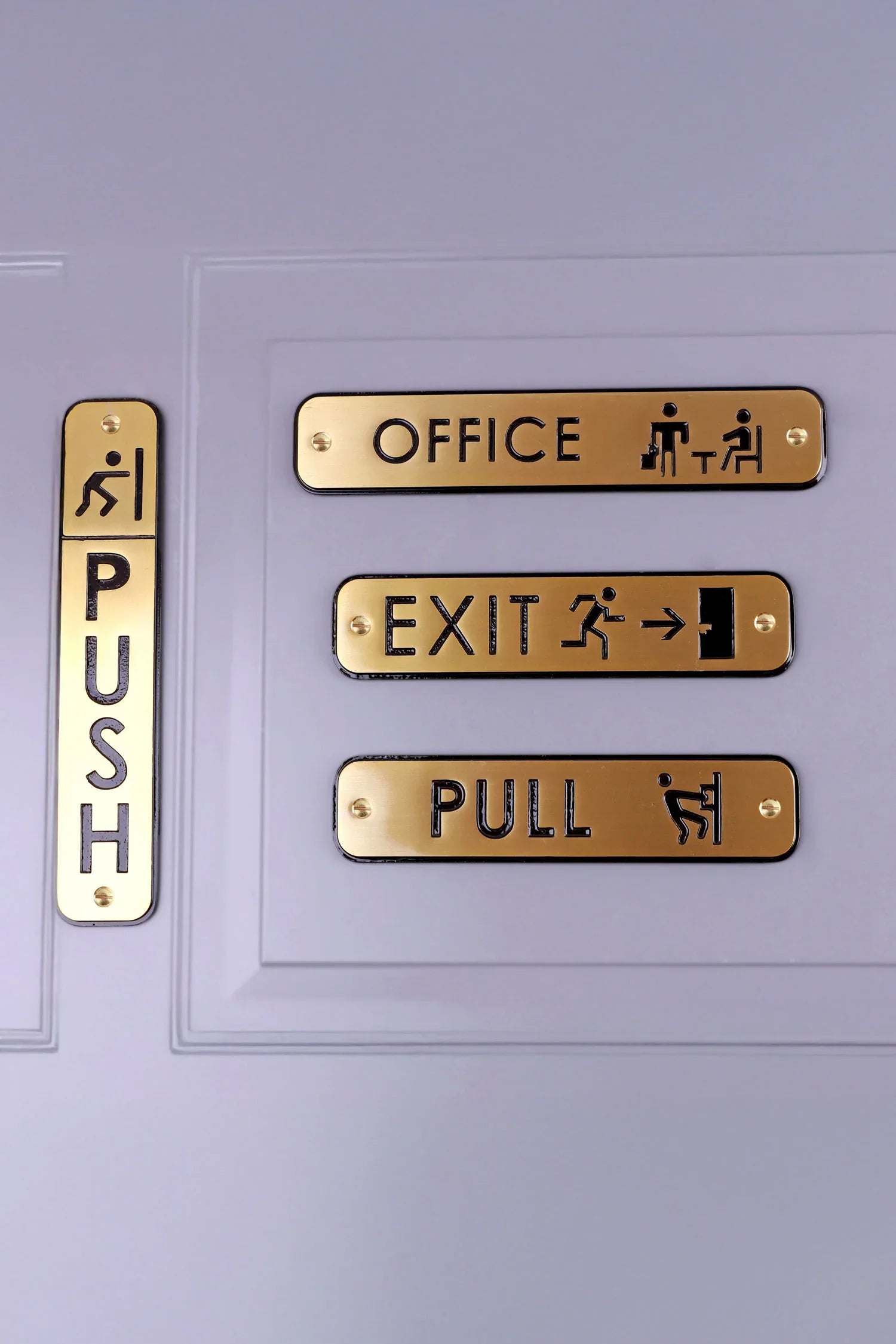 Premium Lacquered Polished Brass Door Sign Engraved Push, Pull, Exit, or Office Plaque for Indoor or Outdoor Display