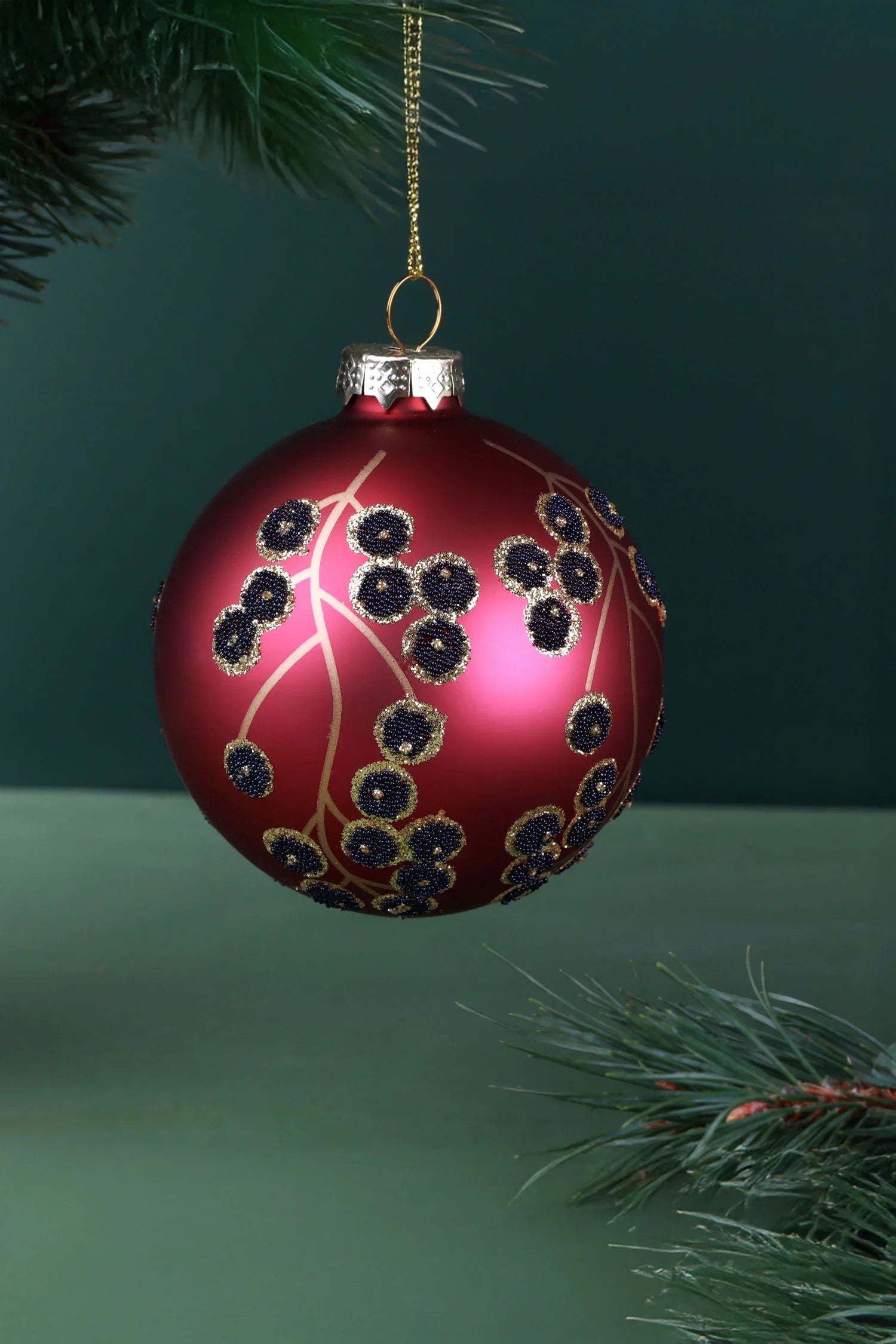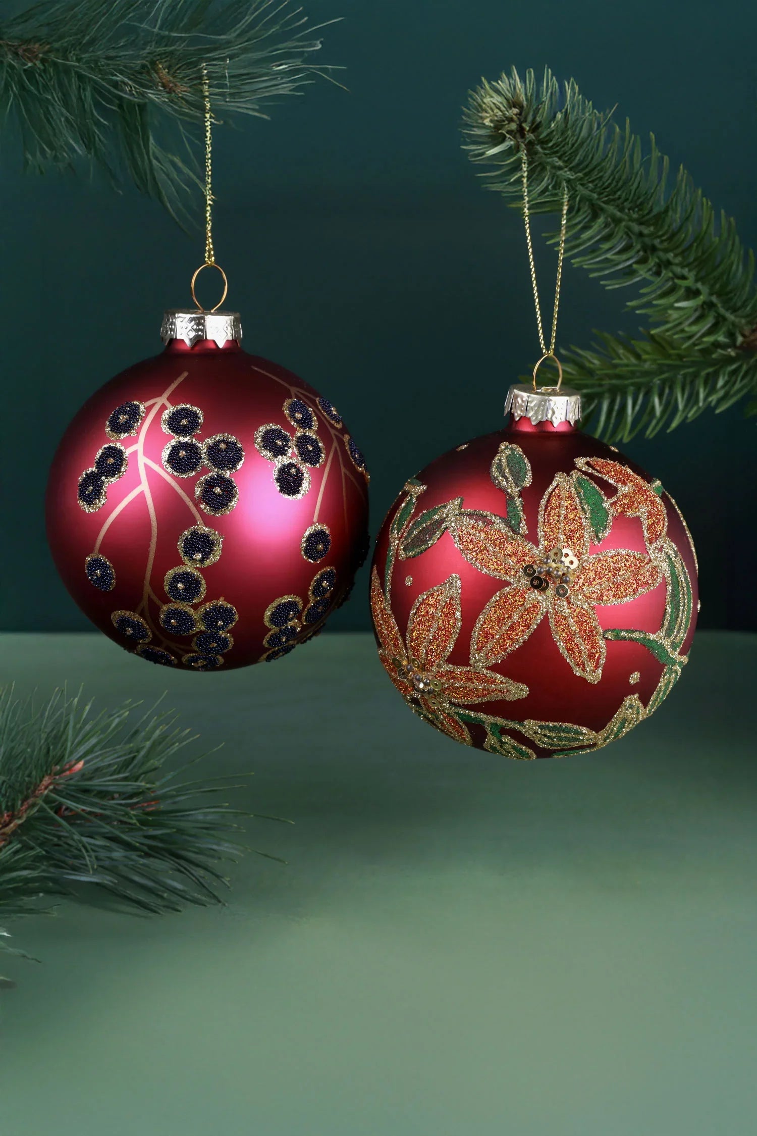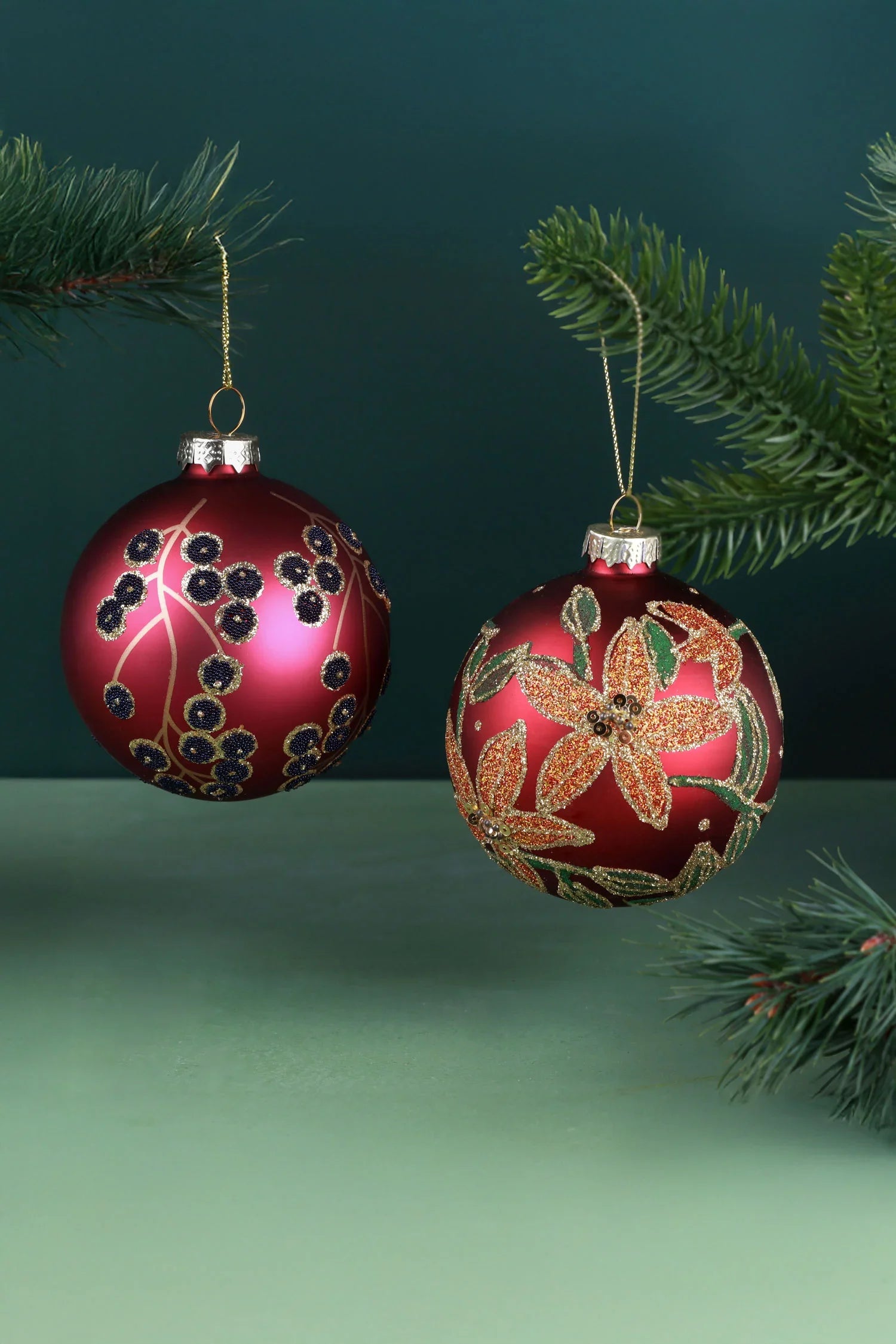 These hand-painted glass baubles carry a warm, wintry atmosphere, the kind associated with candlelight, evergreen branches, and quiet December evenings. Each piece is finished in deep red glass and decorated by hand with glittered detailing that reflects light softly, giving the surface a gentle seasonal glow. The Winter Berry Branch design features winding gold stems dotted with dark berries, creating a woodland-style pattern that feels calm and slightly nostalgic. The Golden Poinsettia version brings a more festive floral mood, with gold petals, green leaves, and small bead centres placed individually. Both designs share the same glass base, muted shine, and traditional Christmas palette. Whether mixed with gold, pine, natural textures, or classic red-and-green décor, these baubles sit easily among other ornaments while still adding character. Made from real glass, they are designed as lasting decorations — pieces to unpack, hang, and enjoy year after year.
