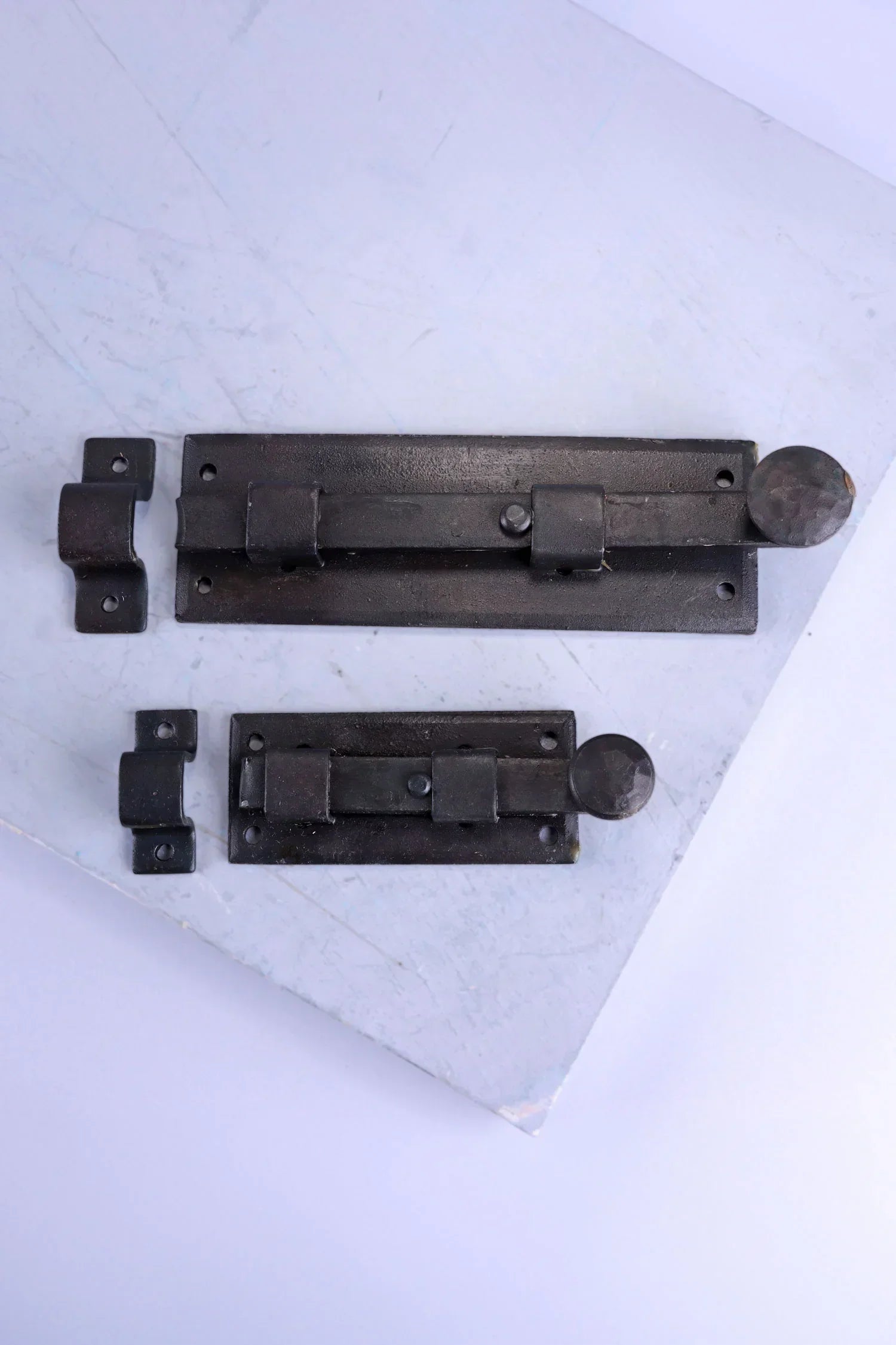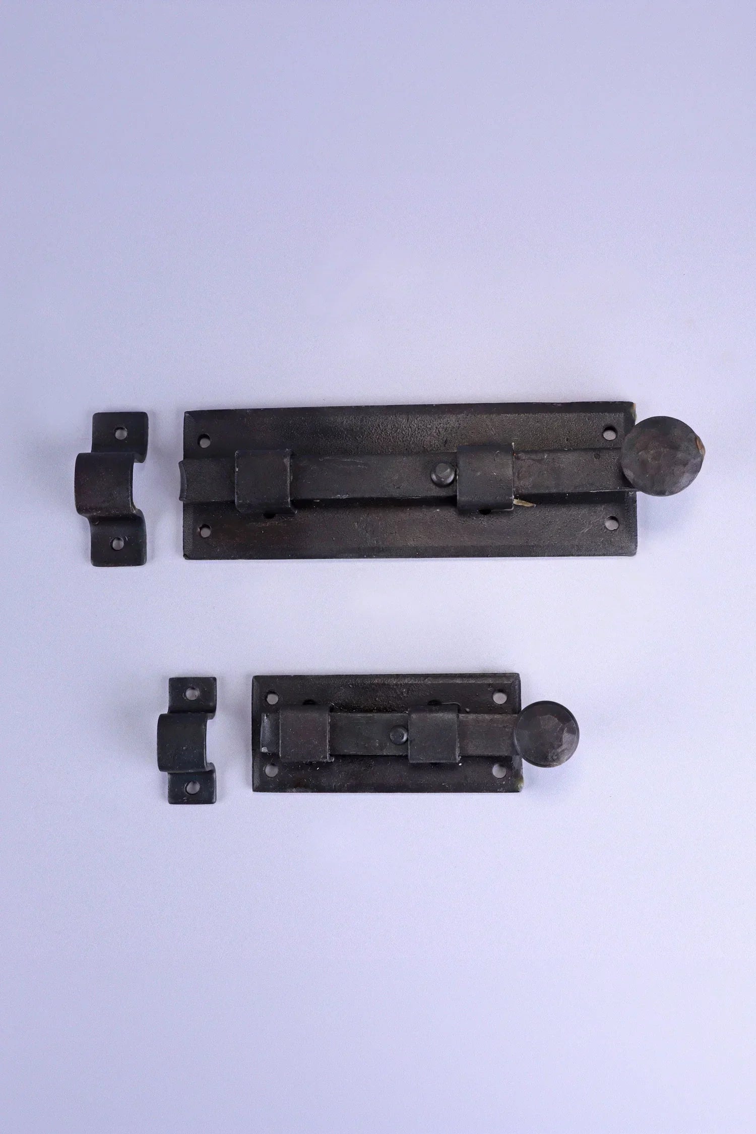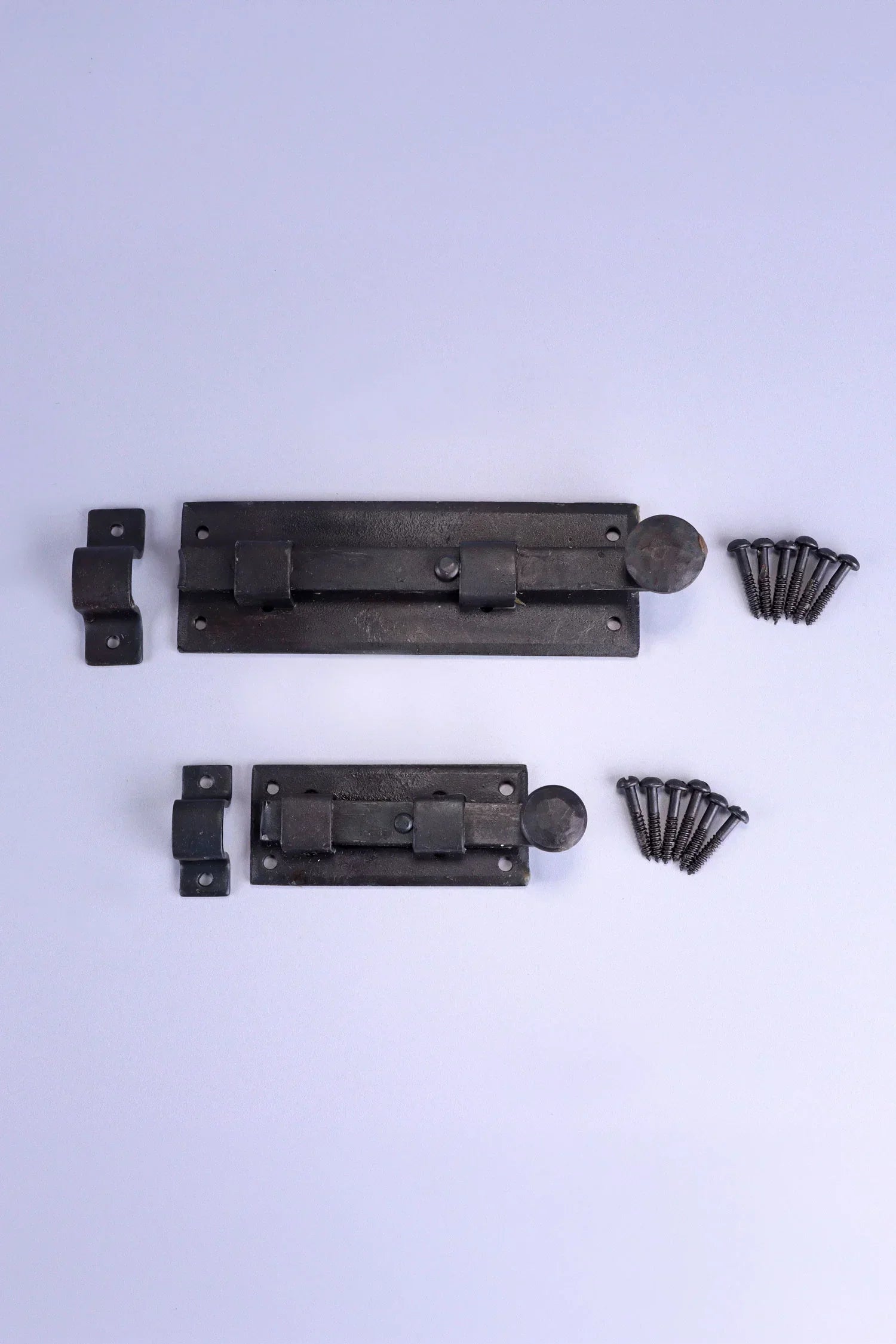 This hand-forged sliding door bolt is crafted from solid iron and finished with a traditional hammered surface that reflects classic blacksmith workmanship. The design combines strength, practicality, and traditional style, making it suitable for both period properties and rustic interiors. The iron is protected with a traditional beeswax finish, which complements the natural depth of the metal while providing a protective layer against everyday wear. The dark iron tone and hammered texture complement timber doors, cupboards, gates, and furniture. The sliding barrel mechanism operates smoothly and securely, providing a simple and reliable method for fastening doors and panels. Its robust construction makes it suitable for a wide range of applications, including internal doors, gates, cupboards, shed doors, and furniture. This door bolt is available in two size options, allowing selection according to preference or the requirements of the installation. The bolt is designed for surface mounting and installs easily using the fixing holes provided on the base plate and receiving keep. Matching fixing screws are included.