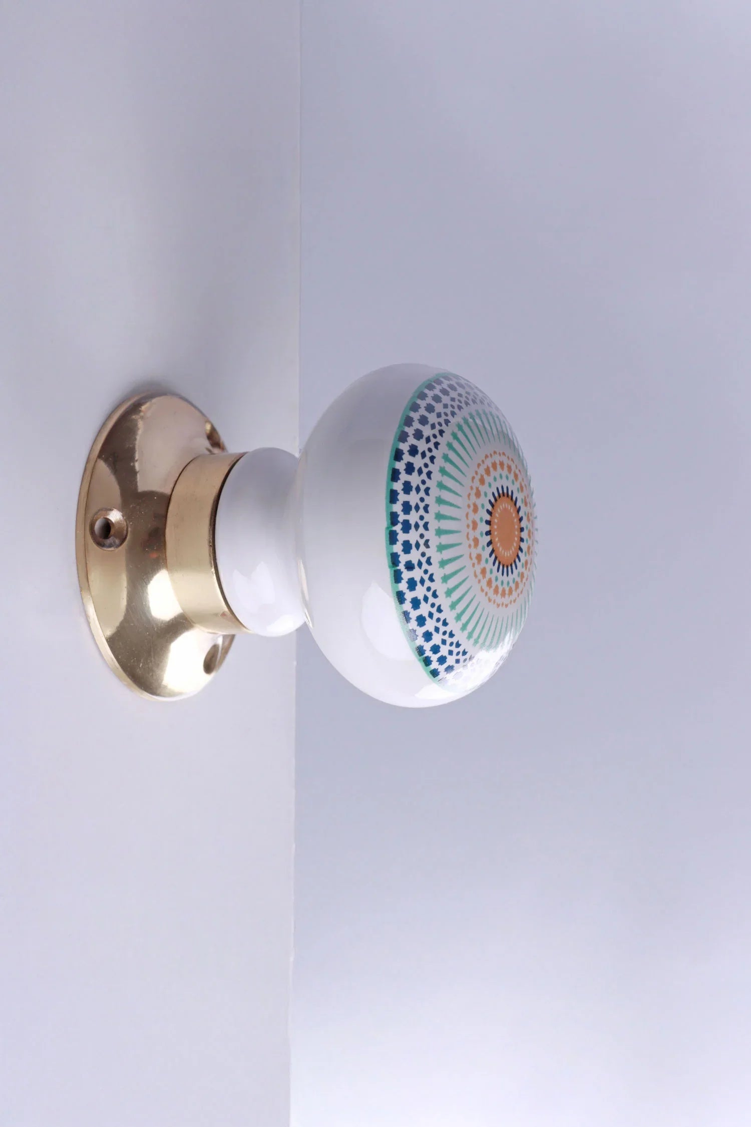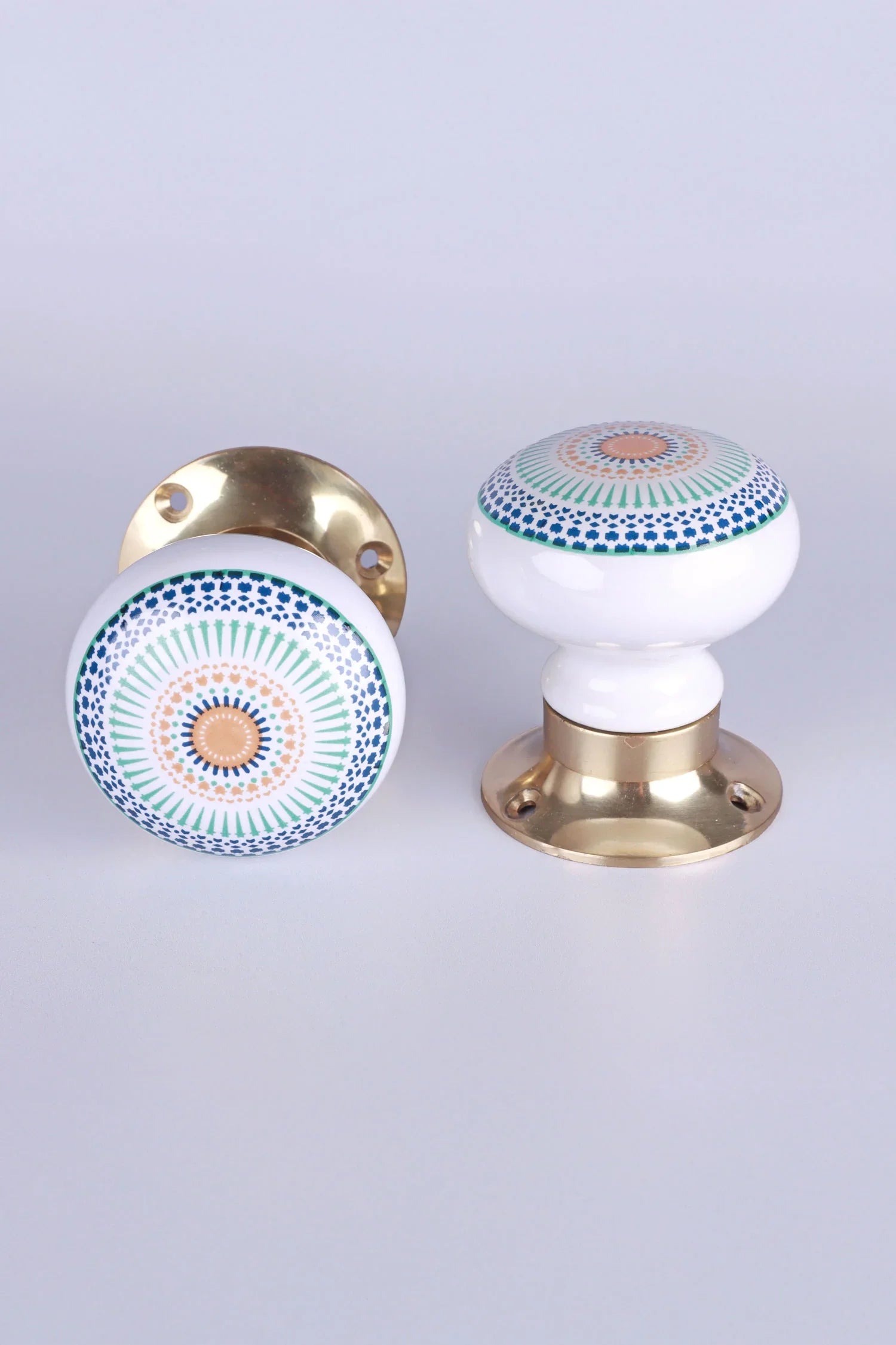 Crafted by hand with precision and care, the Positive Energy Aura mortice door knobs carry a quiet sense of purpose. Each ceramic piece is gently shaped, glazed to a soft sheen, and finished with a symbolic motif that hints at light, balance, and subtle movement. The curves are calm, the pattern composed — created not to shout, but to suggest a feeling that lingers. Inspired by ancient forms once believed to attract harmony and joy, the design is modern in feel yet quietly rooted in something older.  The solid brass base, with its golden warmth, adds more than structure — it brings richness, weight, and a tactile finish that feels considered from every angle. It complements the ceramic perfectly, giving the whole piece a refined presence. This isn’t a detail to blend in; it’s a small, luxurious gesture in a room that reflects great taste. Set includes two turning ceramic knobs (one for each side of a single internal door), an 8 mm steel spindle, and a full set of fixing screws. Once fitted, the knobs connect securely through a standard mortice turning mechanism, ensuring a dependable and smooth operation every time, not just decorative, but a reliable feature in the flow of home life. This set does not include a latch, as most customers can continue using their existing tubular mortice latch. The knobs are specifically designed to work with standard 8 mm spindle-operated latches found in most internal doors. If needed, a standard 60 mm or 70 mm latch needs to be sourced separately. The through-bolt fixing system creates a secure, long-lasting fit between the knobs. Their ceramic construction is mounted on a solid brass base, with a rounded grip shape that's easy to turn. Ideal for internal doors between 3.5 cm to 4.5 cm thick (35 mm to 45 mm), including bedroom doors, kitchen entrances, bathroom doors (with an added lock), and even French-style interior doors. The set fits most solid wood, MDF, or engineered timber doors in the UK. For European customers, the 8 mm spindle size and door thickness should be confirmed before purchase. US-based customers can install these knobs with minor adjustments — a DIY-capable person or carpenter should find it straightforward. This is not a dummy knob set and is intended for functional use on interior doors.