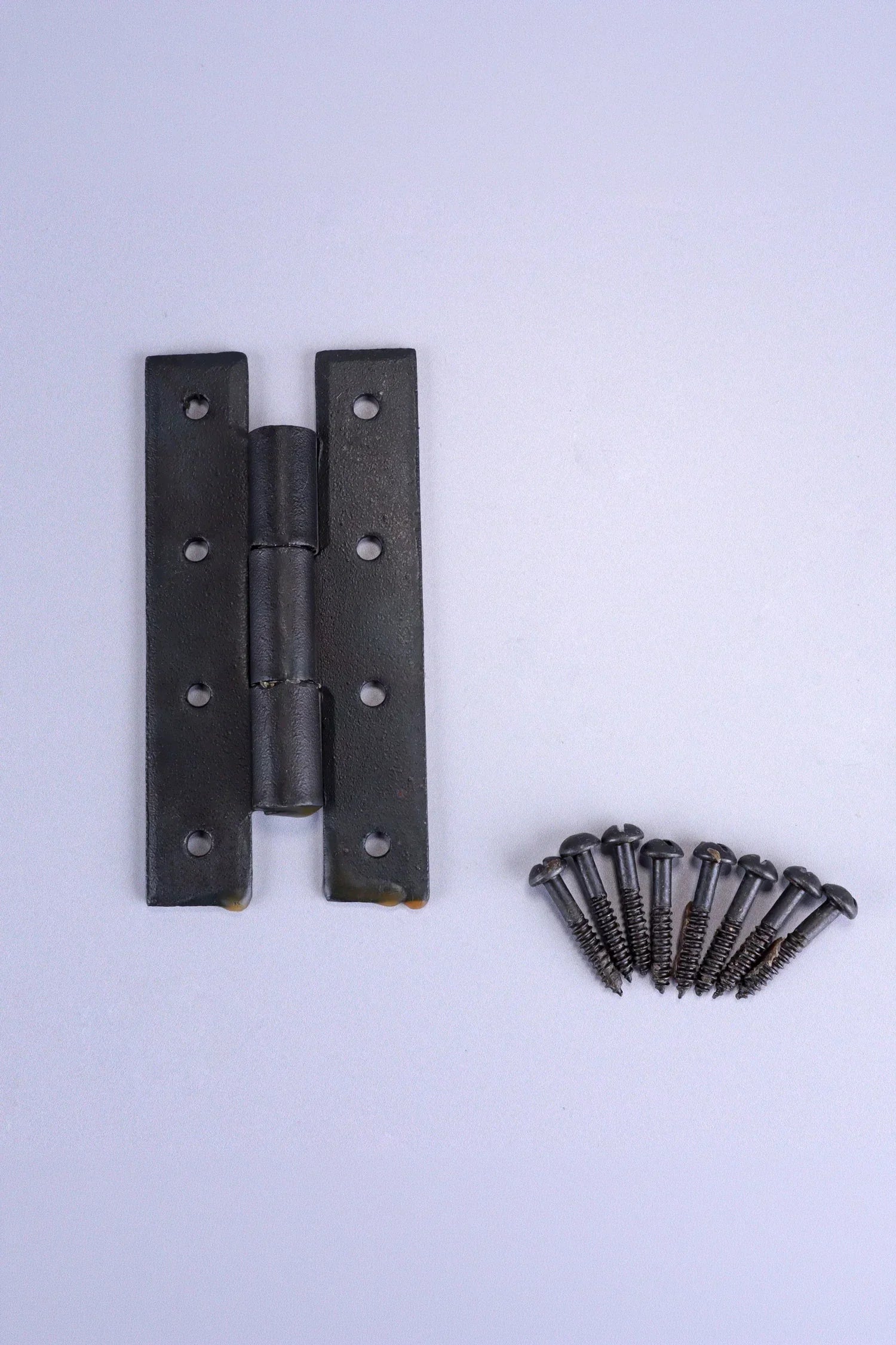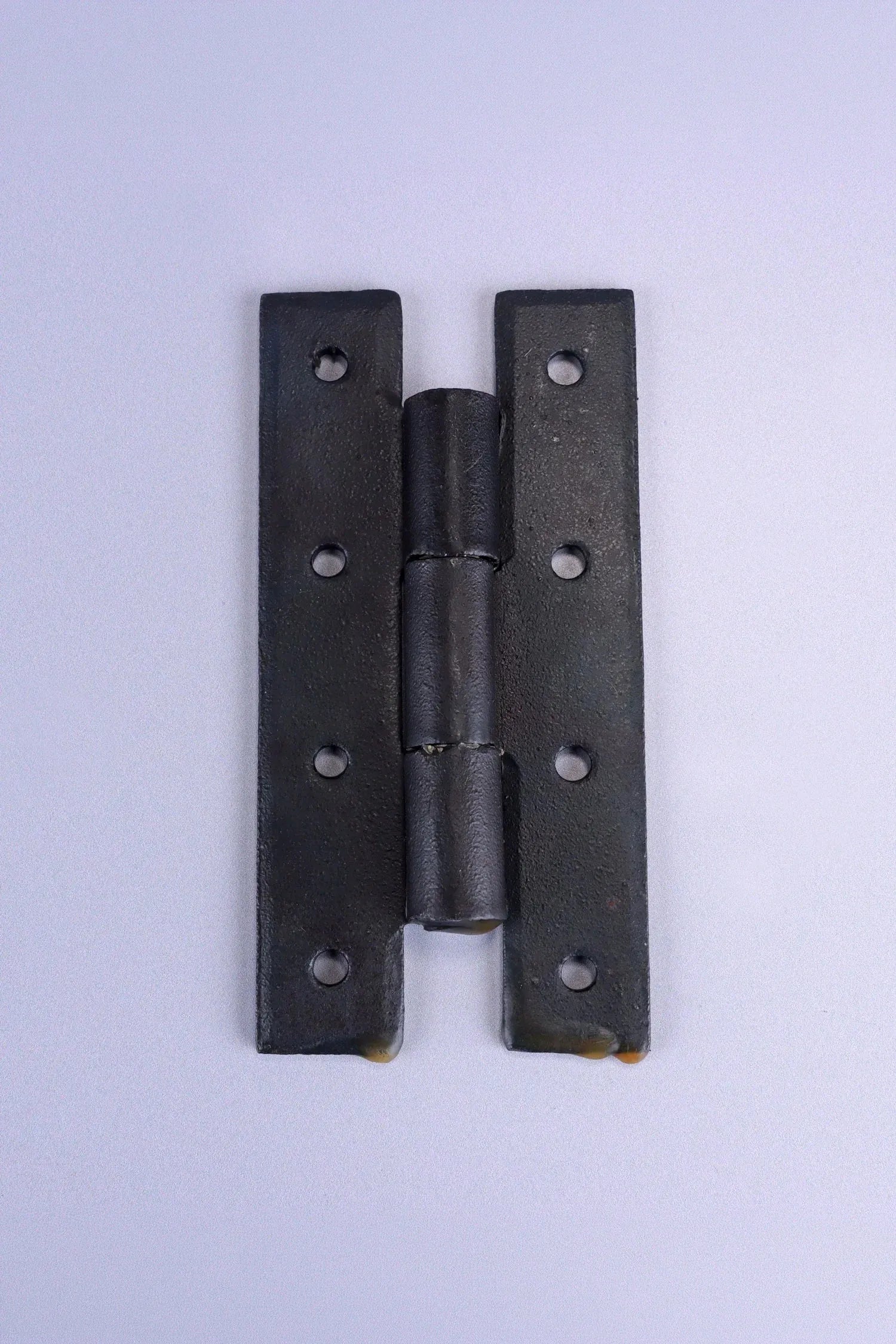 This decorative H hinge is traditionally hand forged from solid iron and finished with a natural beeswax coating that protects the surface while preserving the authentic character of the metal. The clean H-shaped design offers a simple and traditional appearance, making the hinge a suitable choice for furniture and cabinetry where visible iron hardware forms part of the overall look. Produced using traditional forging methods, the iron has a subtly textured surface with natural tonal variation rather than a perfectly smooth machine-made finish. The hinge is designed for indoor use, making it well-suited for kitchen cupboards, pantry cabinets, interior cupboard doors, wooden chests, blanket boxes, and handmade furniture. The H-shaped plates provide a balanced fixing surface on both the door and frame, allowing the hinge to sit neatly along the door seam while offering reliable support. Additional hinges can be installed where extra strength or stability is required, particularly for larger doors or heavier wooden lids. The H hinge is supplied with matching fixing screws, allowing straightforward installation onto wooden doors and frames.