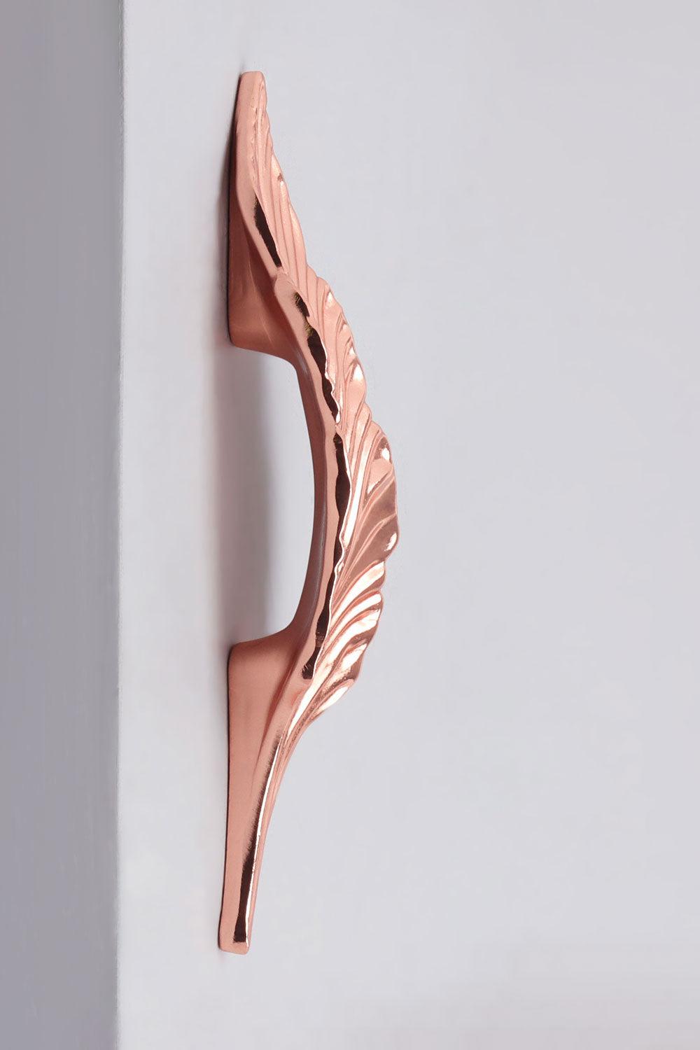 Naturalé No.02 is a sculpted cabinet pull handle with an elongated leaf form, finished in a warm rose gold tone that brings softness and elegance to furniture. The flowing shape and gentle detailing create a decorative focal point, allowing the handle to feel like an intentional part of the design rather than a simple fitting. Well-suited to wardrobes, tall cupboards, statement cabinetry, sideboards, and larger drawers, this handle feels balanced on bigger surfaces, where its length and sculptural form can be fully appreciated. The curved profile is comfortable to hold, making it suitable for everyday use as well as decorative furniture. Designed with left and right orientations, Naturalé No.02 works beautifully on wardrobes and cabinets with doors that open in opposite directions, creating a harmonious and composed look when paired. On drawers, the handle can be fitted freely in whichever direction best suits the overall layout and style of the space. The rose gold finish pairs effortlessly with cream, soft white, beige, blush, taupe, and natural wood tones, and feels especially at home in elegant, boutique-style interiors. Whether used throughout a room or as a standout detail on a single piece of furniture, Naturalé No.02 adds warmth and a refined, jewellery-like touch to interiors. Part of the Naturalé collection, No.02 is designed to bring beauty, balance, and thoughtful detail to cabinetry and furniture.