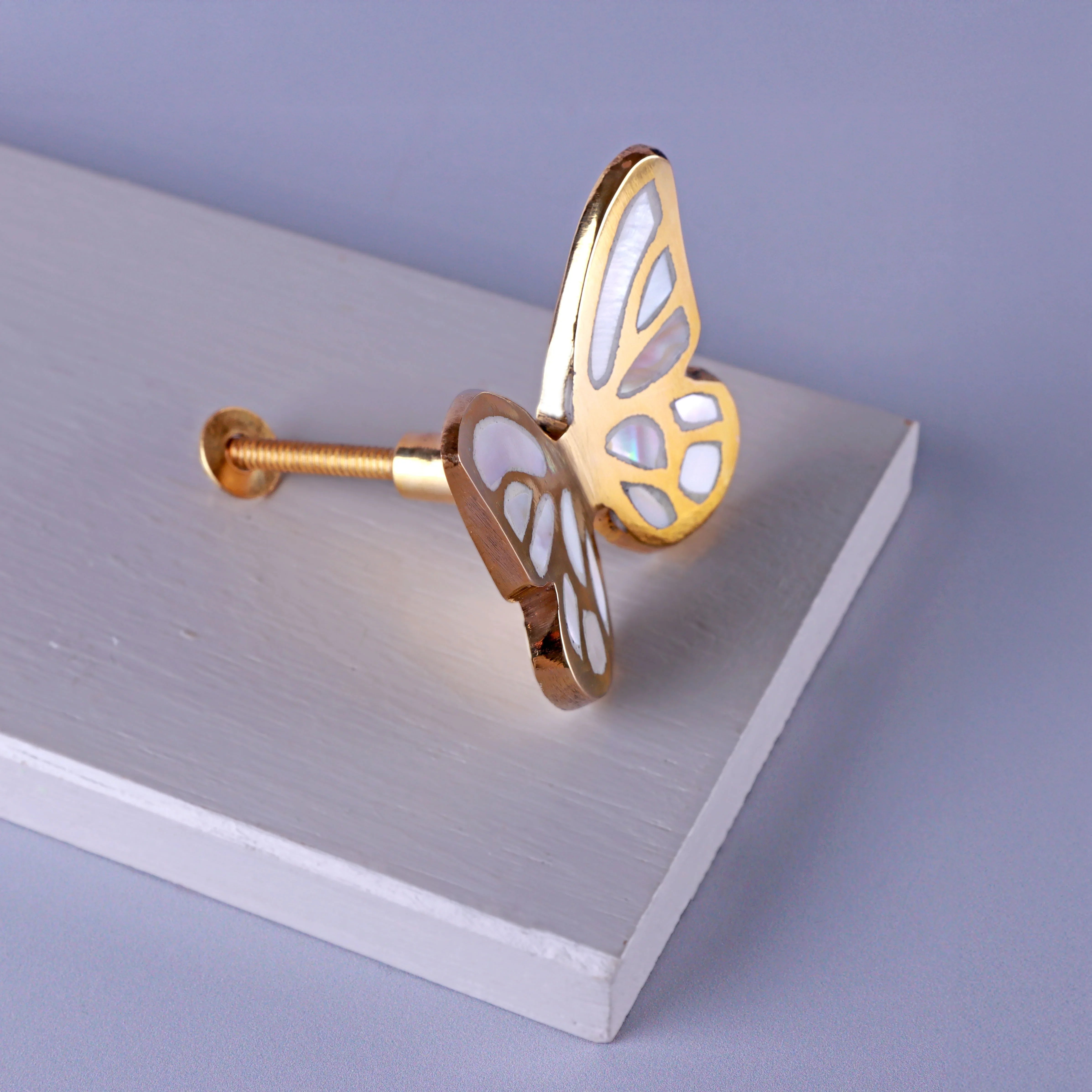 Shaped in the form of a butterfly, this handcrafted knob brings a touch of quiet luxury to any piece of furniture. Made from solid brass and finished by hand, it has a naturally warm glow that feels smooth, weighty and beautifully made. The wings are inlaid with natural Mother of Pearl, each piece placed by hand to create a soft mosaic of gentle iridescence. As the light shifts throughout the day, the surface reveals delicate pearly tones and subtle golden reflections, giving the knob a living quality that changes moment by moment. The butterfly silhouette is softly contoured, offering a comfortable grip while also standing as a decorative detail in its own right — graceful, sculptural and instantly eye-catching. This knob is designed to suit a wide range of furniture, making it perfect for cabinets, drawers, cupboards, wardrobes, dressing tables, bedside units and sideboards. Whether it’s placed on a single drawer or repeated across a set of doors, it brings an elegance that lifts the entire piece. It’s the kind of finishing touch that adds depth to a room — not through brightness or boldness, but through craftsmanship, natural materials and a sense of gentle artistry. Thoughtfully made and beautifully detailed, this butterfly knob turns everyday gestures — opening a cupboard, sliding out a drawer, choosing an outfit — into small, quiet moments of beauty. It offers both function and feeling, bringing a sense of poise and soft luxury into the living spaces.