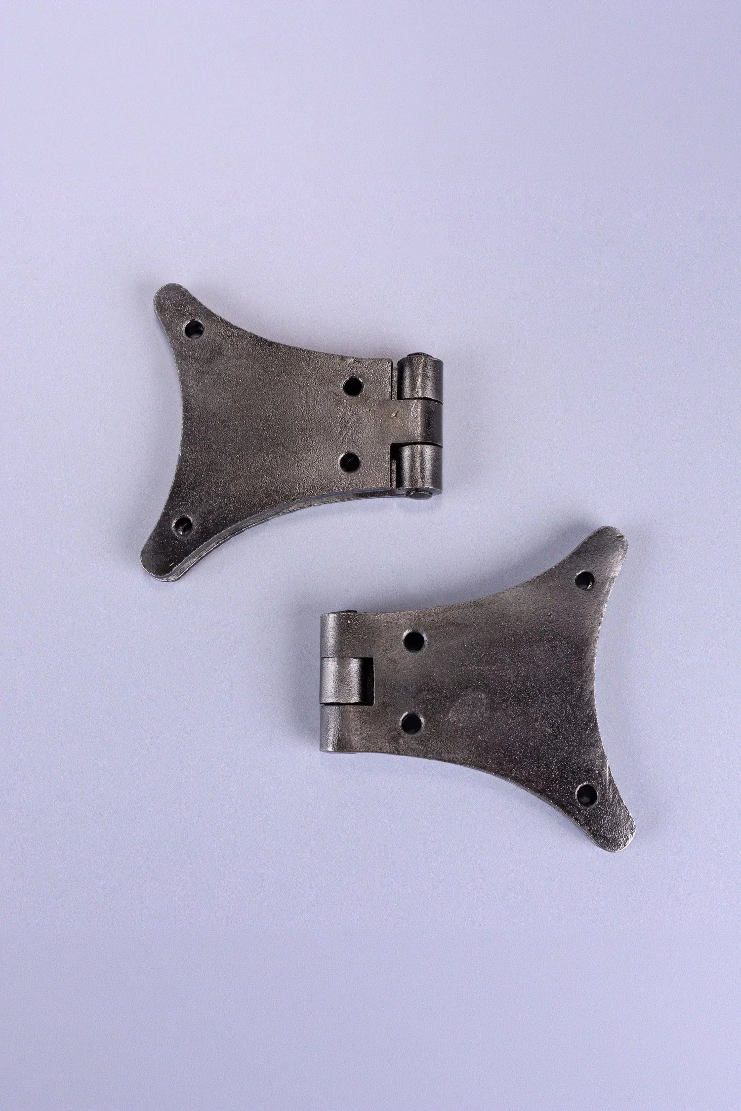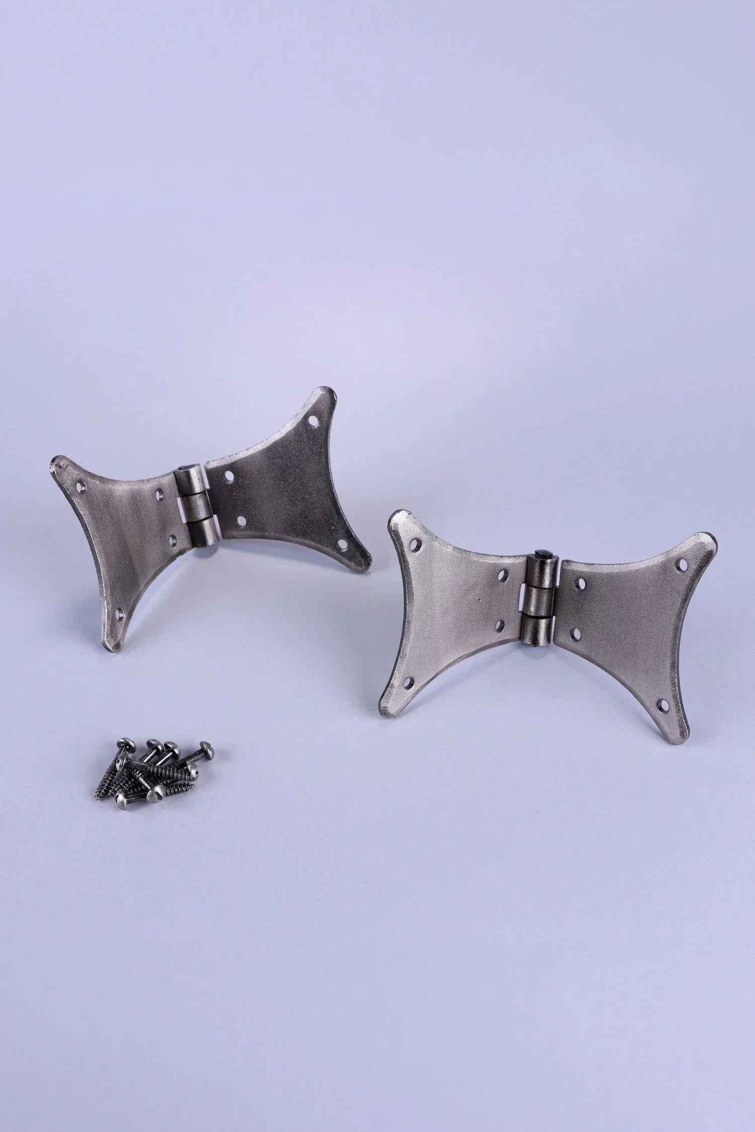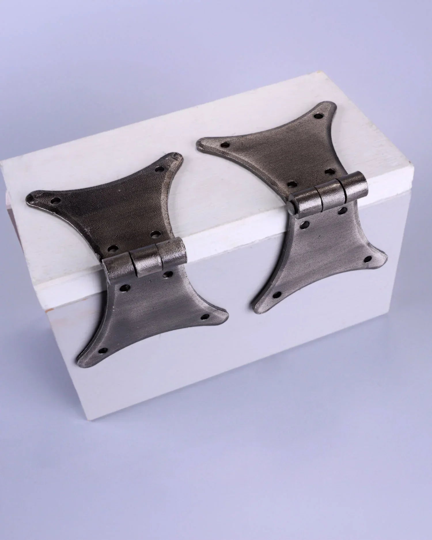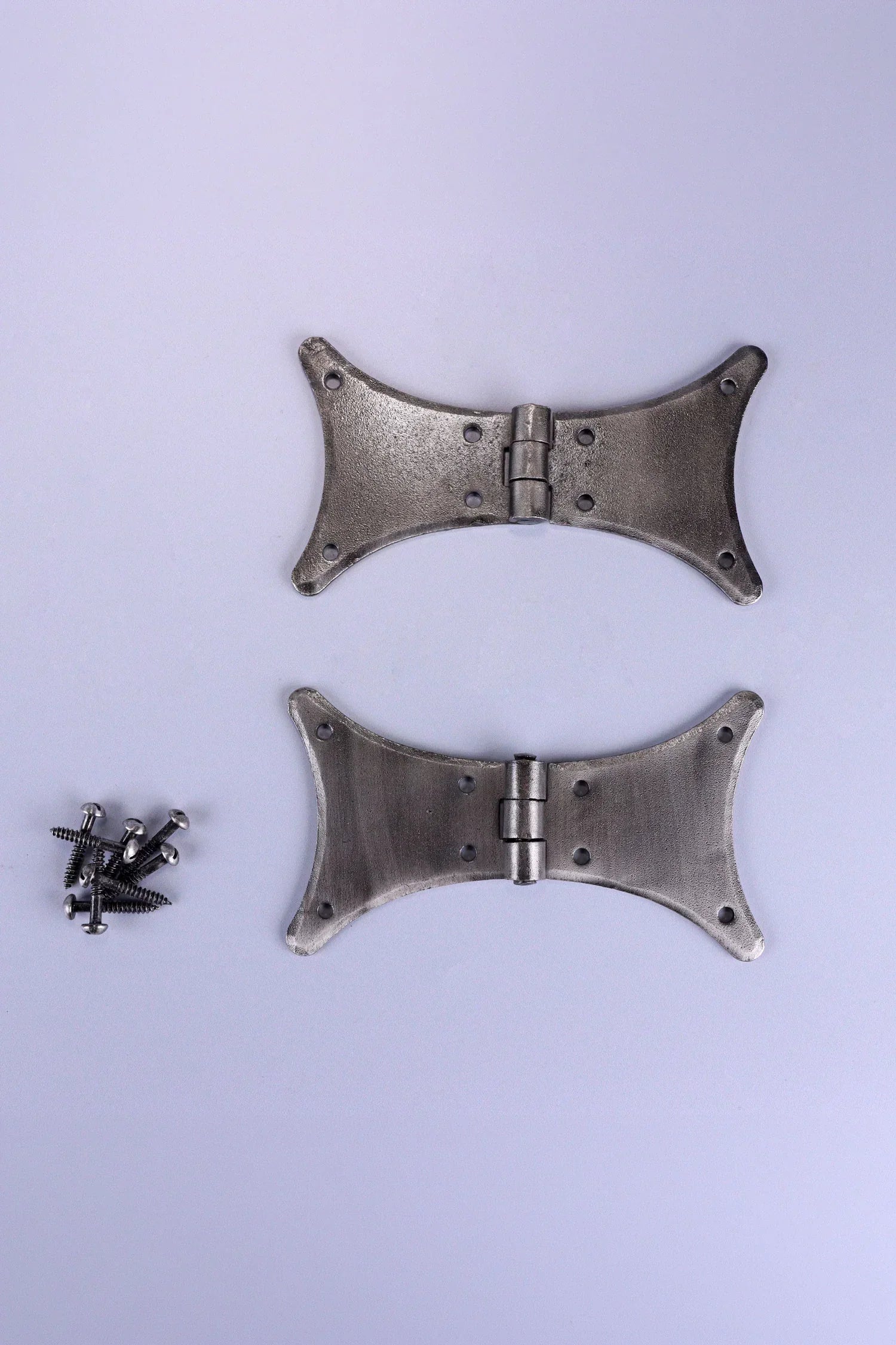 These decorative butterfly hinges are crafted in a classic pewter finish, offering a clean metallic tone that complements both traditional and contemporary furniture. The distinctive butterfly shape provides both structural support and decorative appeal, making the hinges ideal for cabinets, cupboard doors, wooden chests, blanket boxes, and other furniture pieces where visible hardware adds to the overall design. The smooth pewter surface has a soft, brushed appearance that blends easily with natural wood, painted furniture, and neutral interior finishes. The balanced wing design allows the hinge to sit neatly across the door seam while creating a decorative detail on the outside of the cabinet or chest. These hinges are designed for indoor use, making them well-suited to interior furniture and cabinetry. Typical applications include kitchen cupboards, pantry cabinets, interior cupboard doors, decorative storage boxes, blanket chests, handmade furniture, and other indoor wooden pieces where a visible hinge is part of the aesthetic. The wide butterfly wings help distribute the door weight evenly across the wood surface while also acting as a decorative feature. Multiple fixing points provide stable installation and reliable support for cupboard doors and furniture lids. Each set includes two butterfly hinges along with matching fixing screws, allowing straightforward installation onto wooden doors and frames.