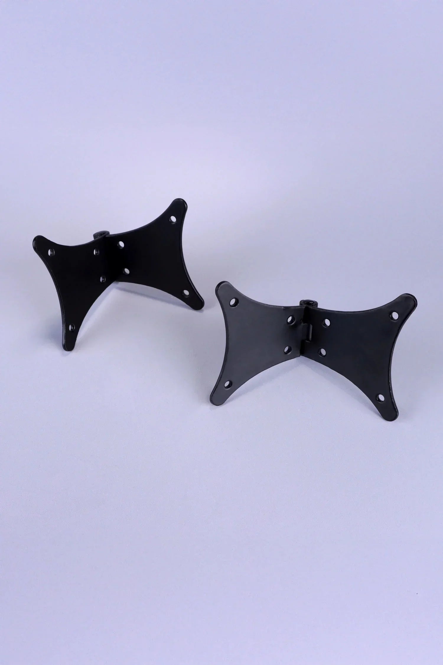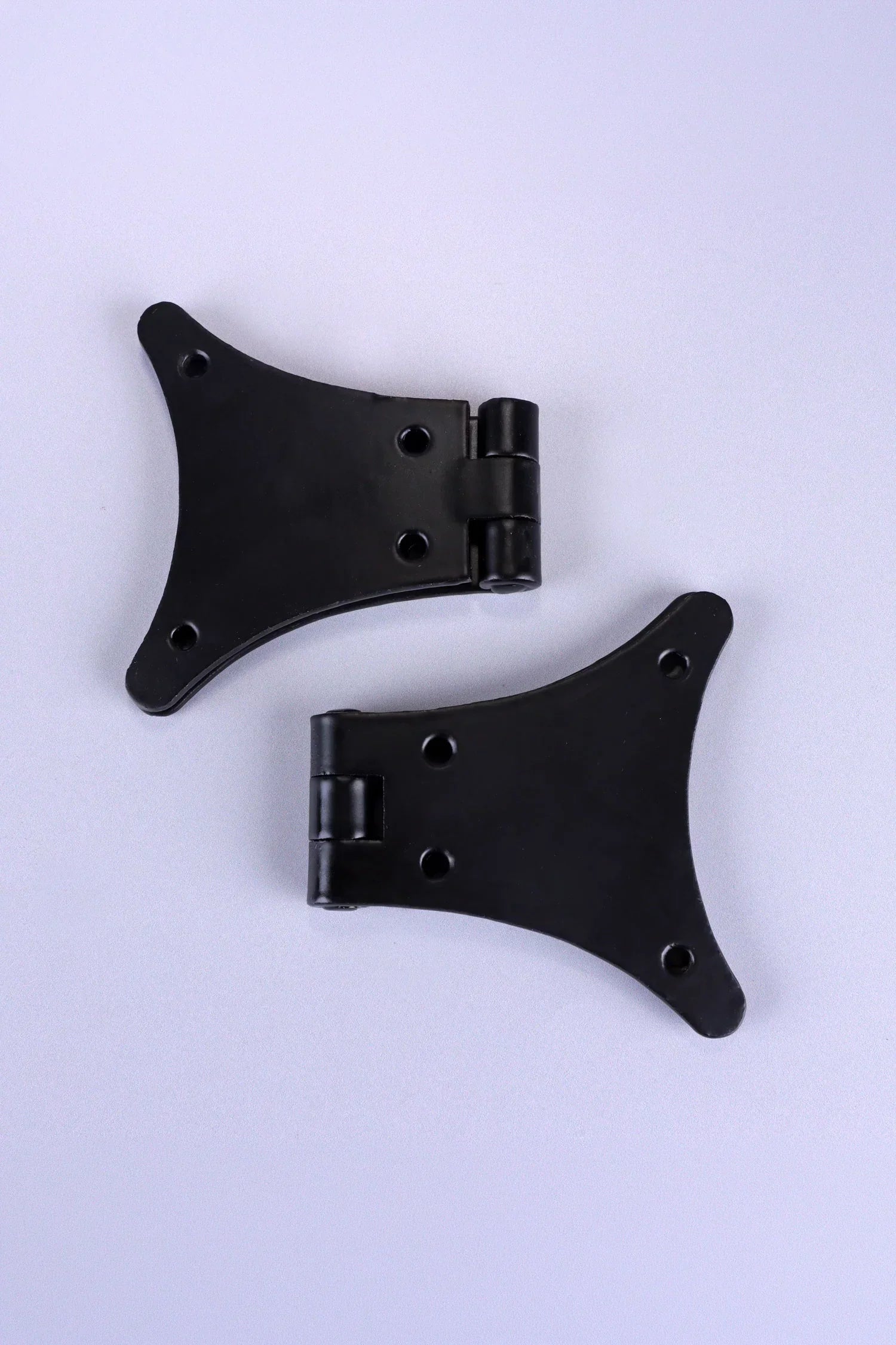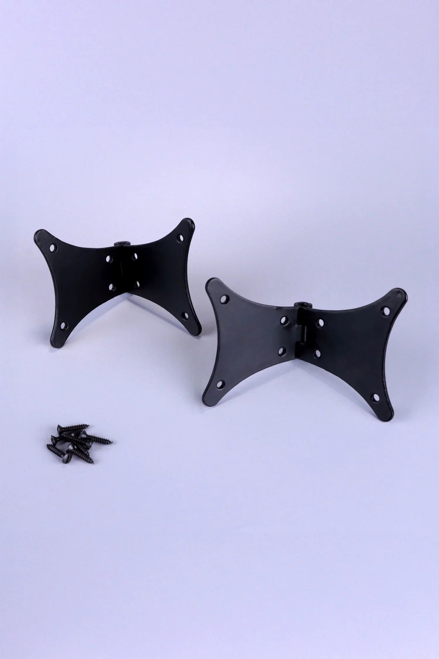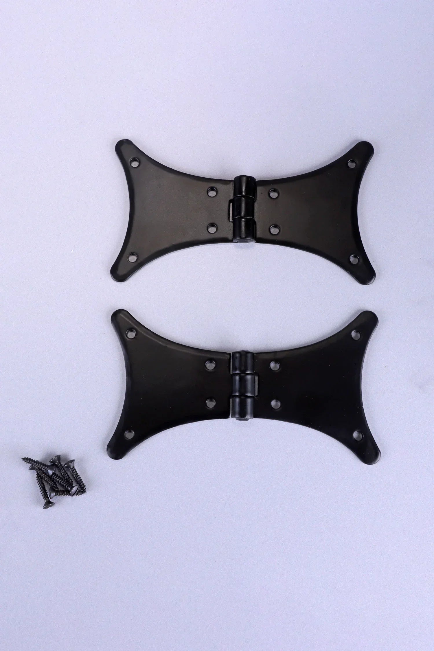 These decorative butterfly hinges are hand forged from solid iron and finished in a traditional black iron coating, which provides both protection and a classic appearance. The distinctive butterfly shape offers strength and visual character, making these hinges suitable for cabinets, cupboard doors, wooden chests, blanket boxes, and other furniture where the hinge itself forms part of the design. Produced using traditional forging techniques, the iron carries subtle surface variations that give the hinges their authentic handmade character. Rather than a perfectly smooth machine-made finish, the surface shows gentle texture and natural tonal variation, which is typical of genuine forged iron hardware. The traditional black iron finish provides a durable protective layer while maintaining the natural appearance of the metal. This finish works well across a wide range of interiors, including farmhouse kitchens, traditional cabinetry, rustic furniture, and handmade wooden pieces. These hinges are suitable for both indoor and outdoor use. They can be installed on kitchen cupboards, pantry cabinets, interior cupboard doors, wooden chests, storage boxes, and decorative furniture. The durable black iron finish also makes them suitable for outdoor applications such as garden furniture, outdoor storage boxes, wooden sheds, and exterior cupboards. The wide butterfly wings help distribute the door weight evenly across the surface of the wood while also acting as a decorative feature. Multiple fixing points provide secure installation and stability for cabinet doors and furniture lids. Each set includes two butterfly hinges along with matching fixing screws, allowing straightforward installation onto wooden doors and frames.