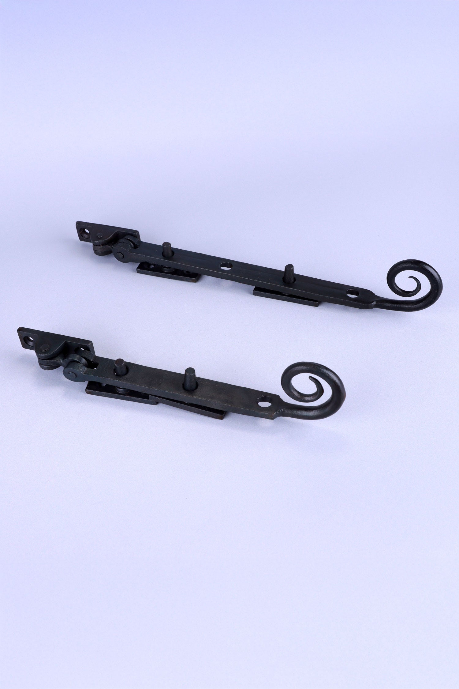 This hand-forged monkey tail window stay offers a traditional and practical way to hold casement windows open while adding a classic decorative detail to the frame. The distinctive spiral “monkey tail” end reflects traditional blacksmith design and brings a classic character to both period homes and rustic interiors. Designed for adjustable positioning, the stay allows the window to be secured in multiple open positions using the supplied pins, helping control airflow while keeping the window safely in place. The simple mechanism makes it easy to operate while maintaining a traditional style of ironmongery. Finished in a natural beeswax coating, the metal surface highlights the texture and character of the hand forged material. The warm, understated tone pairs beautifully with timber window frames and complements cottages, heritage properties and traditional architectural settings. Primarily designed for wooden casement windows, the stay is mounted to the window frame and sash using the fixing holes provided. The adjustable pin system allows the window to be held open at various distances, making it both functional and decorative. Due to the nature of the beeswax finish, this window stay is recommended for indoor use or sheltered locations where the finish can be maintained and preserved over time.