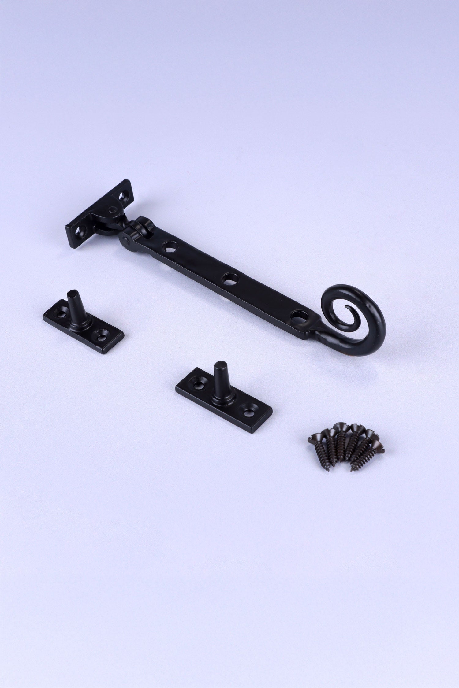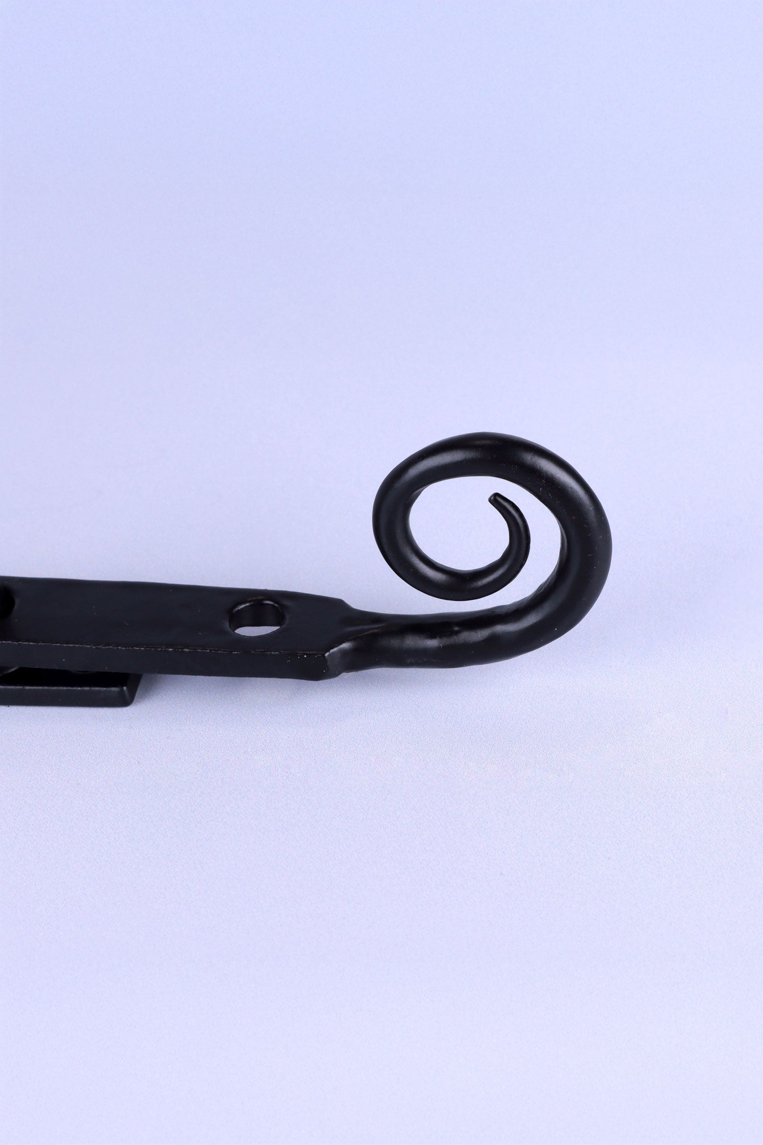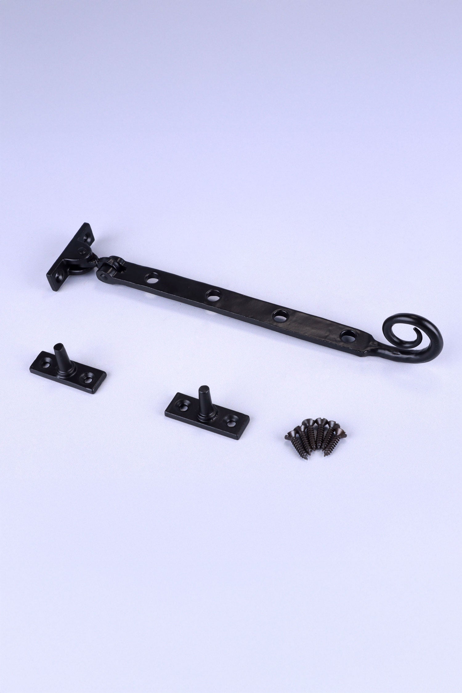 This hand-forged monkey tail window stay provides a traditional and practical way to hold casement windows open while adding a classic decorative detail to the window frame. The distinctive spiral “monkey tail” end reflects traditional blacksmith craftsmanship and brings classic character to both period homes and rustic interiors. Designed for adjustable positioning, the stay allows the window to be secured in several open positions using the supplied pins. This simple and reliable mechanism helps control airflow while keeping the window safely held in place. Finished in a traditional black protective coating, the stay offers a durable and classic appearance that complements timber window frames and traditional iron fittings. The finish makes the stay suitable for both indoor and outdoor use, making it ideal for exterior casement windows and shutters. Primarily designed for wooden casement windows, the stay is mounted to the window frame and sash using the fixing holes provided. The adjustable pin system allows the window to be held open at various distances while maintaining a traditional decorative appearance.