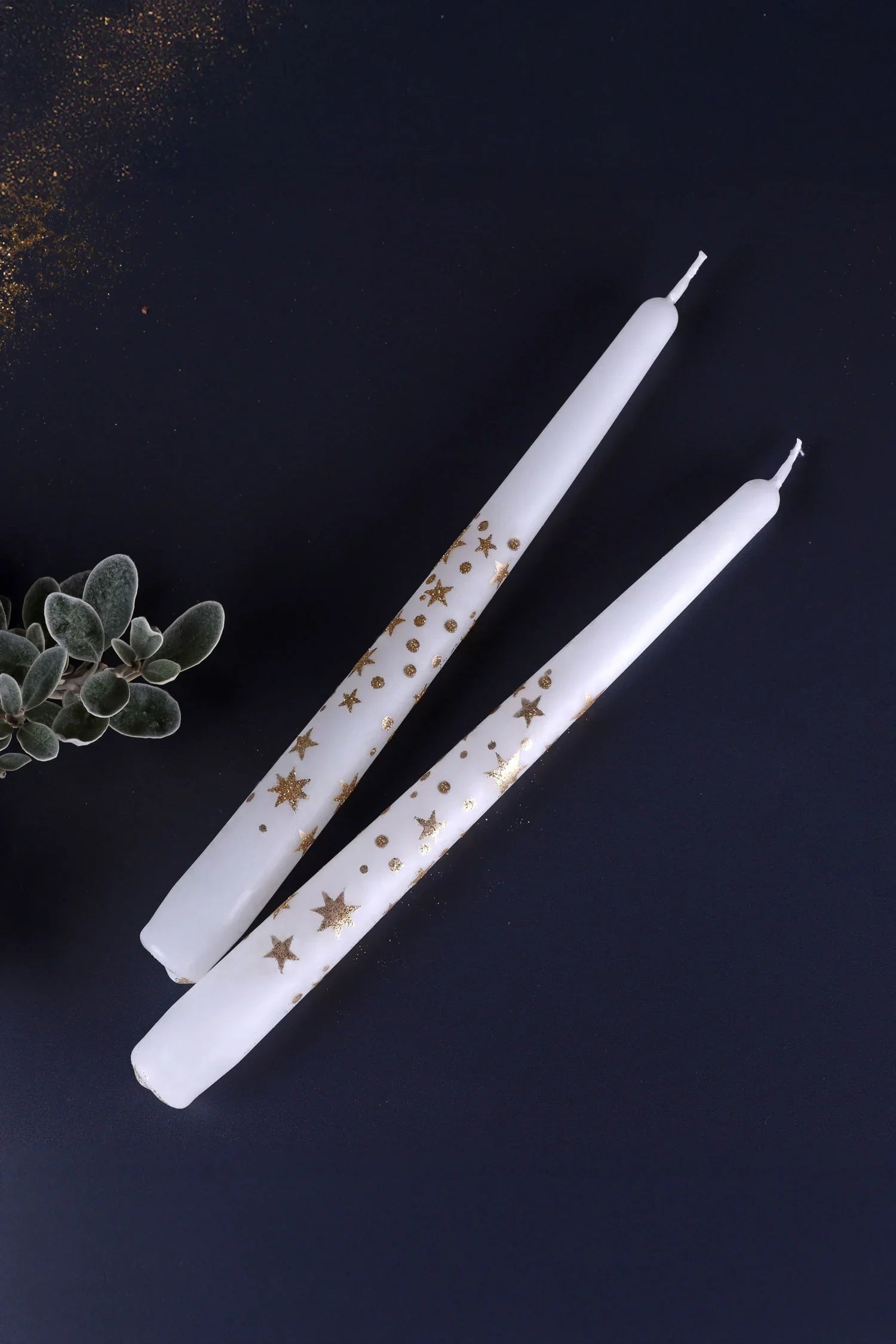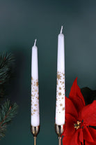 A slender pair of white dinner candles, delicately adorned with hand-finished gold glitter stars, brings a sense of occasion to any setting. Subtle in shape yet full of seasonal poetry, these tall tapers combine elegance with just a hint of celestial glow — a balancing act of restraint and radiance. Each star is applied individually, creating a soft constellation of glitter that catches ambient light in a way that feels both festive and refined. The white wax base keeps the look clean and contemporary, while the touches of gold add a gentle warmth that suits both grand celebrations and intimate winter evenings. Perfectly suited to seasonal moments — from Christmas dining tables layered with evergreen branches, to New Year’s Eve toasts raised beneath candlelit reflections. They work equally well at winter weddings, where their golden accents complement frosted florals and soft metallic décor, or as part of an understated birthday table setting with flowing linens and champagne tones. The pair offers visual ease and luxury — whether placed in vintage brass holders, ceramic candle stands, or glass silhouettes that allow the stars to shimmer in stillness. This set speaks the language of subtlety: versatile enough to follow throughout the seasons, meaningful enough to mark treasured moments along the way. Never leave a burning candle unattended. Keep away from flammable materials, pets, and children. Trim the wick before each use and ensure the candle is placed on a stable, heat-resistant surface. Stop burning when 1 cm of wax remains to prevent overheating or damage to surfaces.