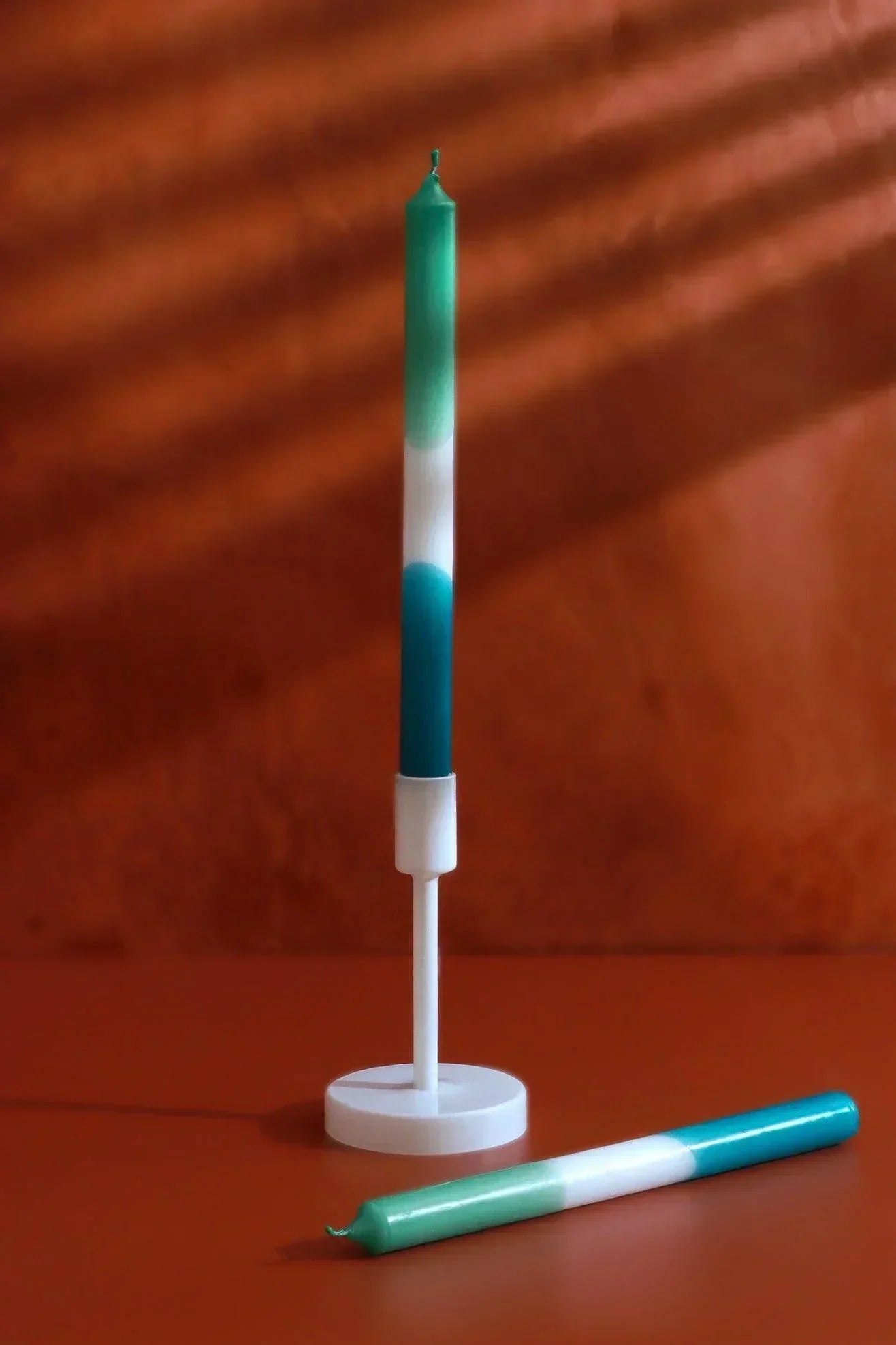 Fresh and quietly grounding, the Pine Light candle set draws its character from the depth and calm of green tones found in nature. Each candle is hand-finished with care, creating a gentle ombre blend that moves from soft white into rich pine green, with muted hints of forest and soft shadow woven through the fade. The result is a colourway that feels balanced and natural, bringing an unmistakable sense of calm into any space. The beauty of this pair lies in its quiet strength. The green tones are deep, and the gradual transition of colour gives the candles an understated elegance that works effortlessly across interiors. When lit, the glow warms the green effortlessly, creating an inviting contrast between cool colour and golden light. The effect is calm, comforting and beautifully atmospheric, whether styled on a dining table, mantelpiece or as part of a quieter evening arrangement. Hand-finishing gives each pair its own personality. The surface texture holds the light softly, allowing the colour to deepen and shift as the flame flickers. Suited to every season, Pine Light carries a sense of rooted elegance. It holds a natural richness without formality and brings a grounded beauty that feels just as fitting in winter evenings as it does in lighter months. Thoughtfully made and quietly expressive, this set offers a subtle statement — one shaped by colour, warmth and craftsmanship.