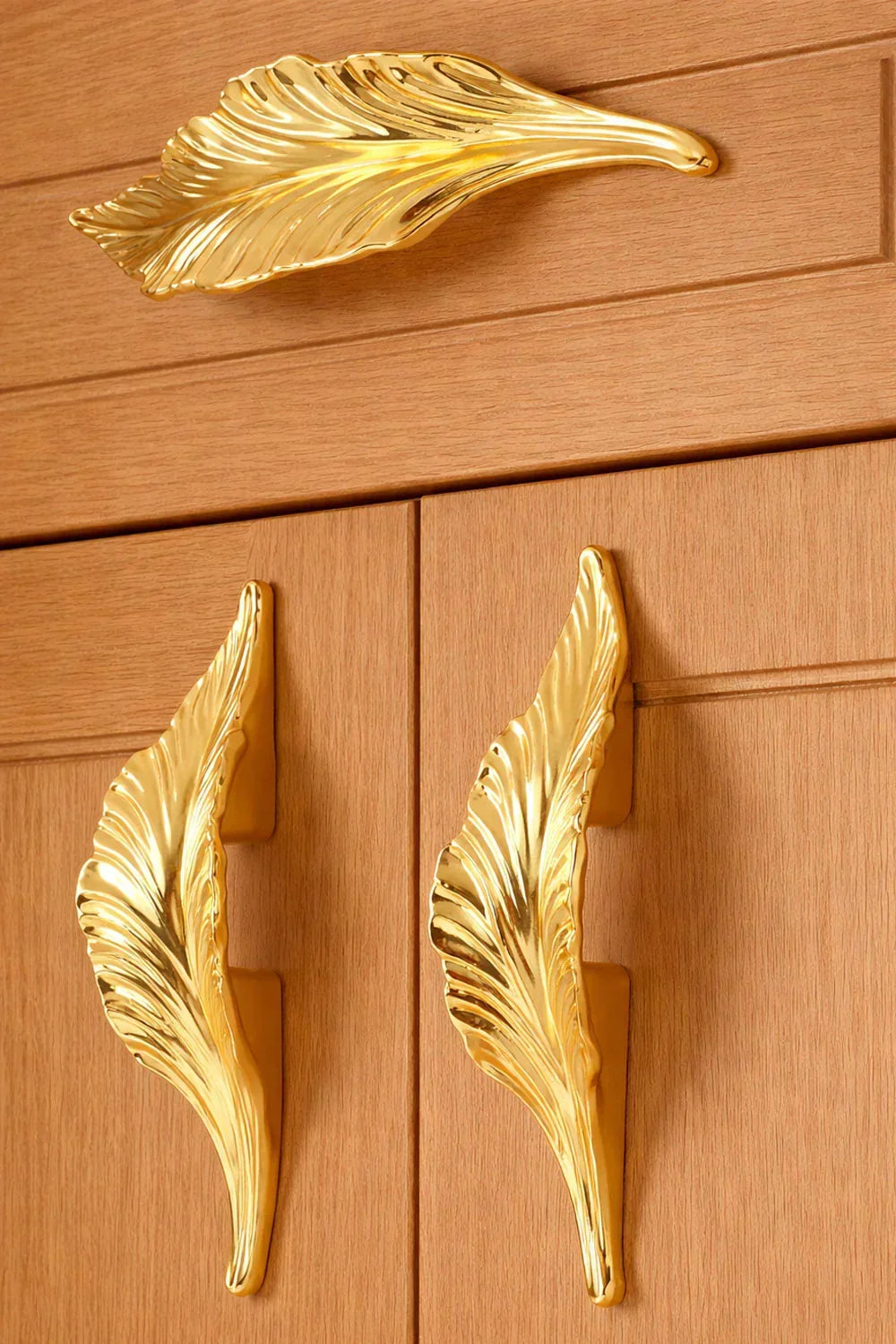 Naturalé No.01 is a sculpted gold cabinet pull handle shaped in a graceful leaf form, designed to bring softness and elegance to furniture. The elongated curves flow gently from end to end, creating a sense of movement that feels natural and decorative. The gold finish highlights the sculpted detailing, allowing light to settle beautifully across the surface. This handle is especially suited to wardrobes, tall cupboards, statement cabinetry, sideboards, and generously sized drawers, where its length and form feel balanced and intentional. Once fitted, it becomes part of the furniture’s character — not just something to touch, but something to notice. Naturalé No.01 can be installed left or right, giving complete freedom when styling a space. It can be used in mirrored pairs for a composed, symmetrical look, or positioned more freely where a softer, relaxed arrangement is preferred. The shape is comfortable in the hand, making it a pleasure to use as part of everyday living. Stylistically, this handle feels at home in beautifully layered interiors. It looks particularly striking against painted cabinetry, warm wood tones, and calm neutral colours. Left and right orientations allow Naturalé No.01 to sit beautifully on wardrobes and cabinets with opposing doors, while drawers can be fitted freely in the direction that feels right for your space. Whether used in an elegant bedroom, a boutique-style dressing room, or an elegant kitchen, Naturalé No.01 adds a jewellery-like detail that gently completes the space. Part of the Naturalé collection, No.01 is designed to bring a sense of beauty and considered detail to furniture and interiors.