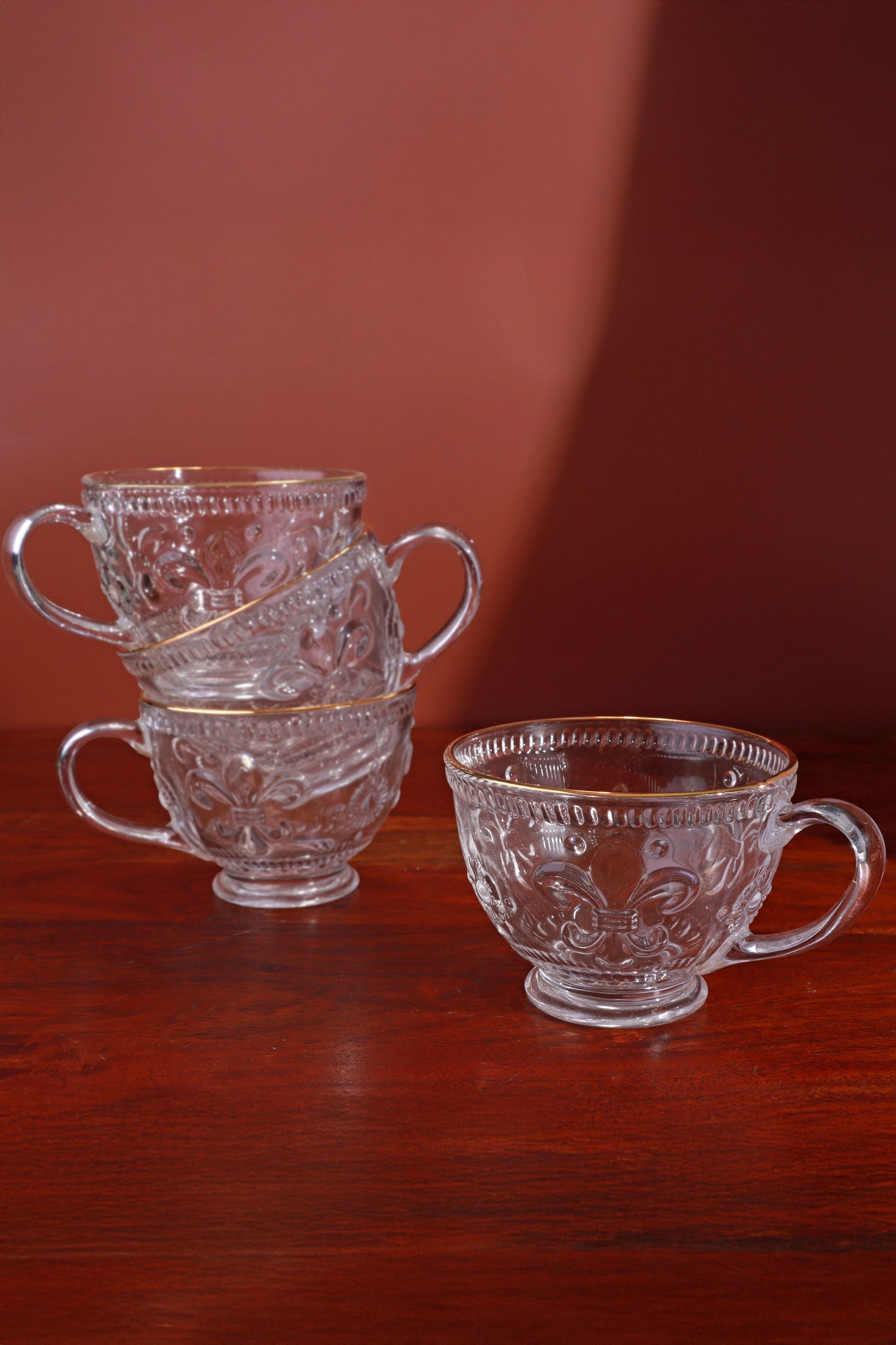 Set of 4 Marcelle Fleur-de-Lis Glass Mugs Embossed Cups with Gold Rim