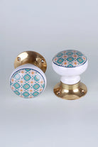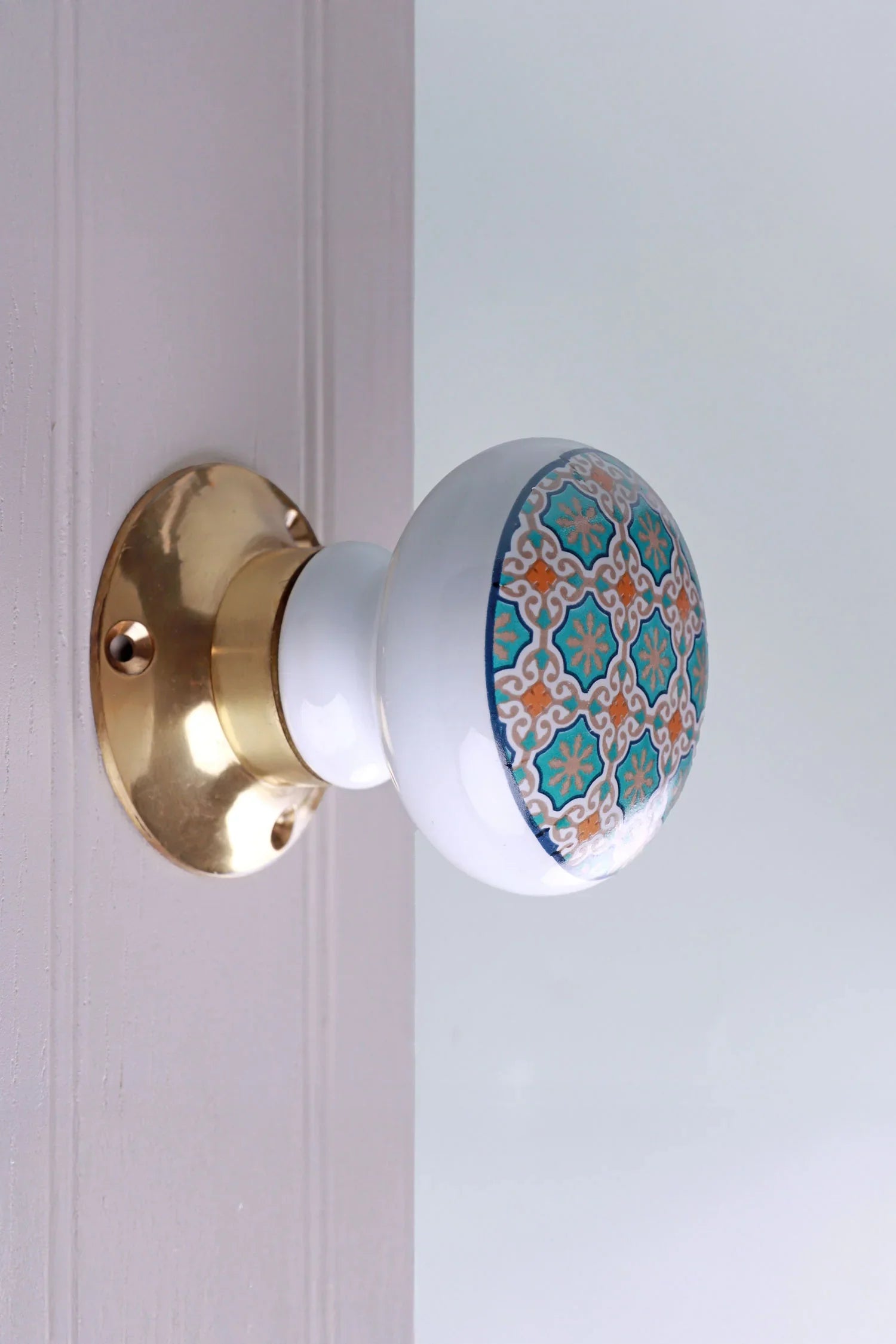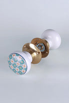 Designed with intention and shaped by hand, the Divine Will Brass Edition brings thoughtful energy into the heart of any space. The surface features a hand-painted motif inspired by sacred geometry—its repeated starburst patterns symbolising inner strength, purpose, and quiet resilience. Every piece is crafted using traditional ceramic moulds, then finished with care to preserve the depth and clarity of the design. The subtle teal, warm amber, and white tones form a beautiful lattice. The solid brass base, rich and weighty, grounds the design with a sense of permanence. Polished to a soft golden sheen, it simply holds its presence, pairing perfectly with modern or heritage interiors alike. This is more than a doorknob. It’s a daily reminder of design done with care—made for homes where detail and intention matter. Set includes two turning ceramic knobs (one for each side of a single internal door), an 8 mm steel spindle, and a full set of fixing screws. Once fitted, the knobs connect securely through a standard mortice turning mechanism, ensuring a dependable and smooth operation every time, not just decorative, but a reliable feature in the flow of home life. This set does not include a latch, as most customers can continue using their existing tubular mortice latch. The knobs are specifically designed to work with standard 8 mm spindle-operated latches found in most internal doors. If needed, a standard 60 mm or 70 mm latch needs to be sourced separately. The through-bolt fixing system creates a secure, long-lasting fit between the knobs. Their ceramic construction is mounted on a solid brass base, with a rounded grip shape that's easy to turn. Ideal for internal doors between 3.5 cm to 4.5 cm thick (35 mm to 45 mm), including bedroom doors, kitchen entrances, bathroom doors (with an added lock), and even French-style interior doors. The set fits most solid wood, MDF, or engineered timber doors in the UK. For European customers, the 8 mm spindle size and door thickness should be confirmed before purchase. US-based customers can install these knobs with minor adjustments — a DIY-capable person or carpenter should find it straightforward. This is not a dummy knob set and is intended for functional use on interior doors.