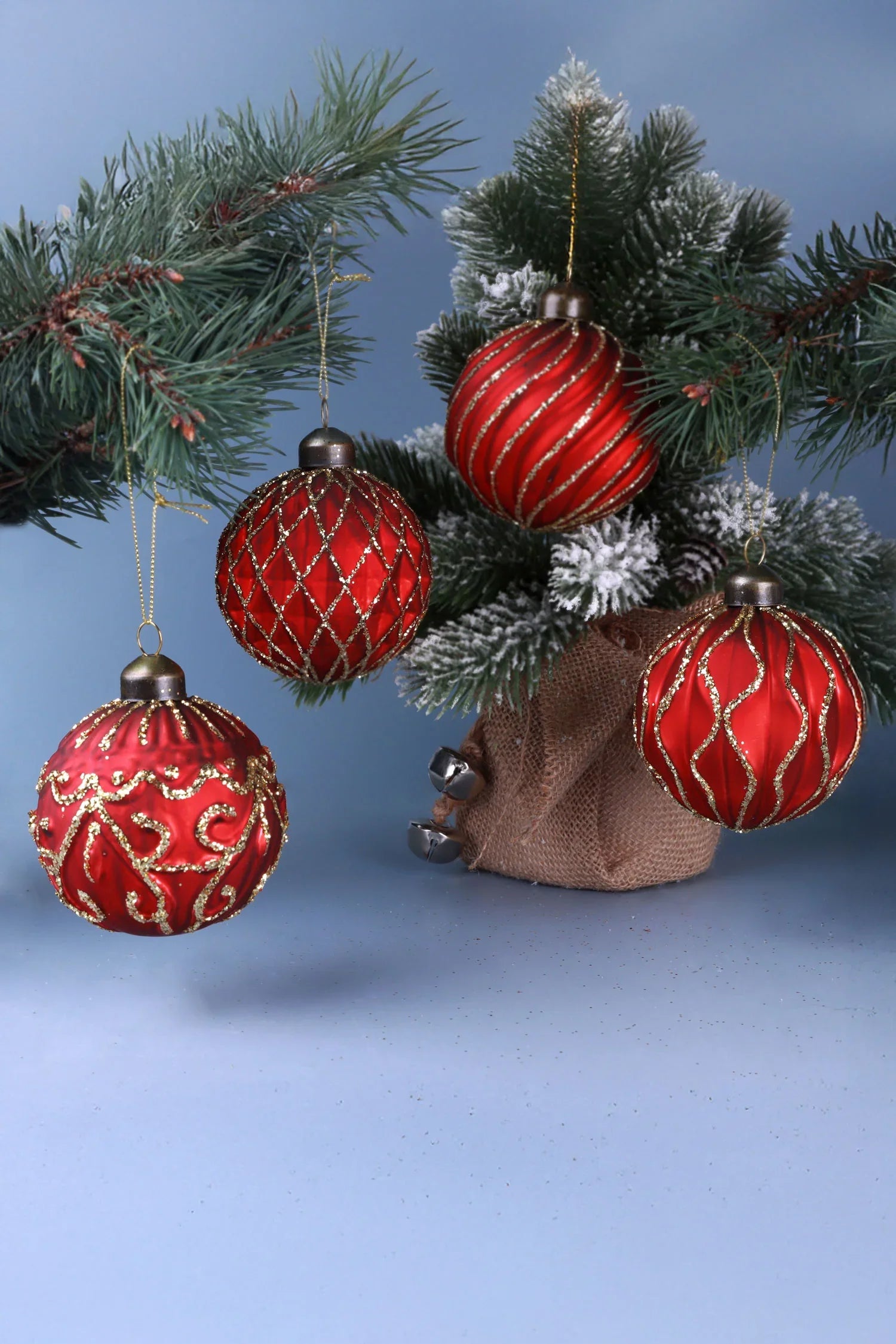 A set of four hand-painted glass baubles in deep satin red, each finished with a complementary gold design. The patterns vary — delicate curves, quiet lattice work, reflective swirls — giving subtle visual rhythm across the tree. The surface has a soft matte sheen that diffuses light gently, while the gold detailing creates a quiet contrast, designed to respond to both daylight and candlelight settings. The collection is built around balance: each piece is distinct, but clearly belongs together. Hung together, they give shape and texture to a branch or garland. Mixed into an existing scheme, they offer immediate coherence. The palette is quietly traditional — red and gold — but the finish is restrained, free from excess shimmer or heavy ornamentation. Made from glass and painted by hand, this is a set intended for recurring use rather than seasonal novelty — the kind of understated decoration that works as well in a refined, tonal interior as it does in a more classical festive setting.