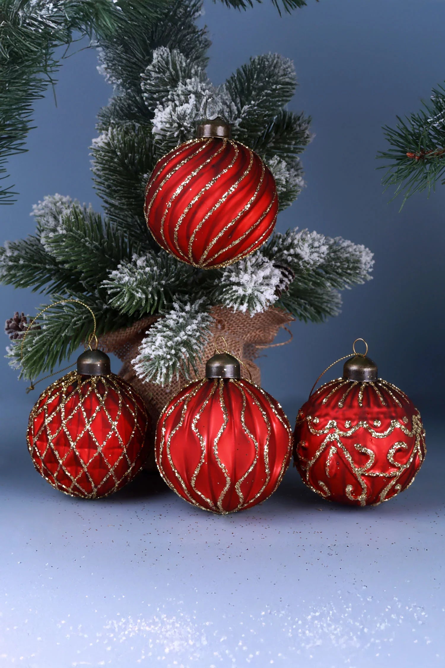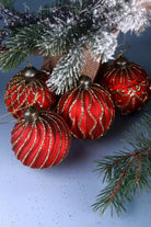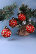 Set of 4 Hand-Painted Satin Red Glass Baubles Luxury Gold Detail Christmas Tree Ornaments