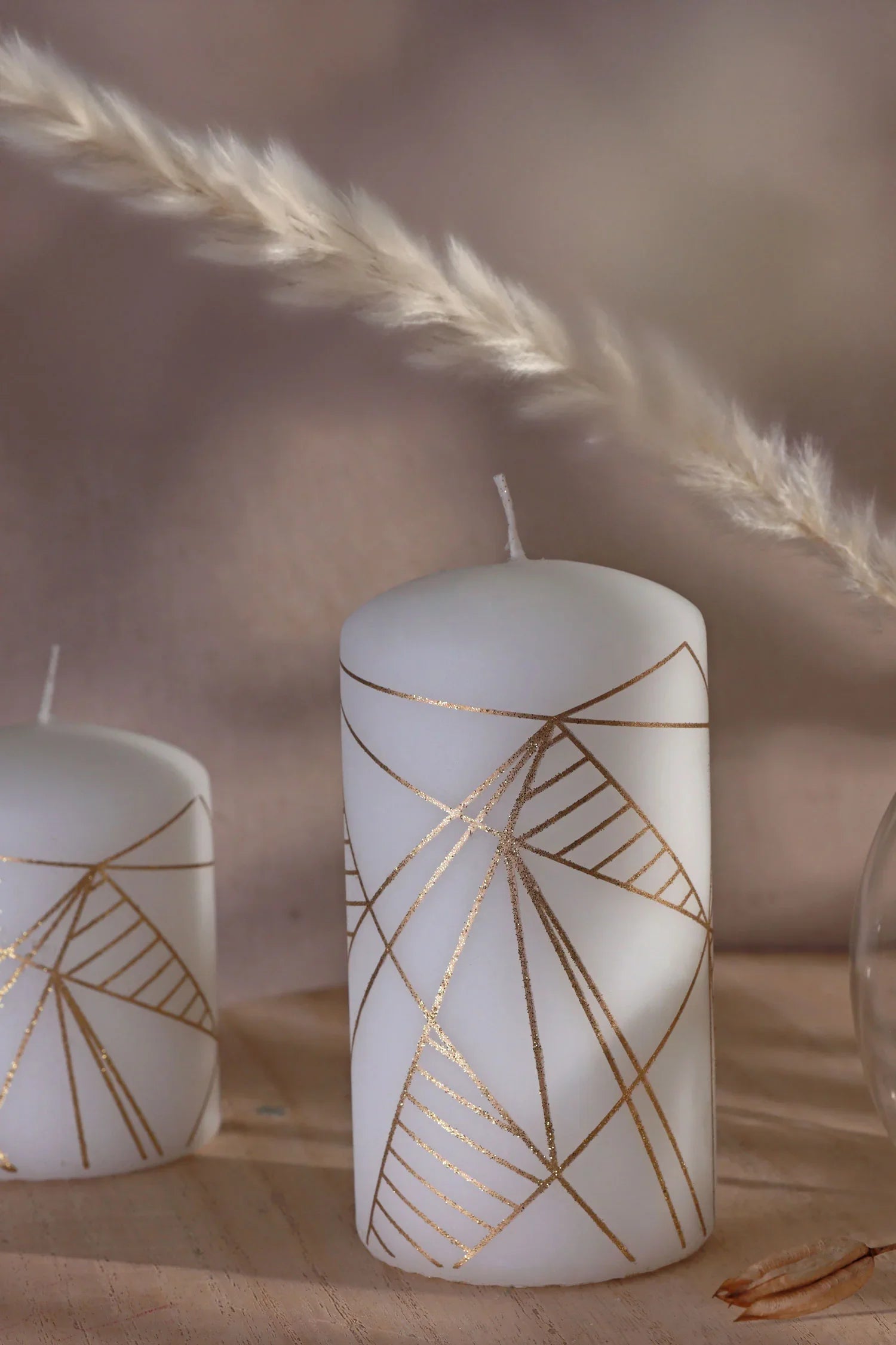 Modern White Pillar Candle with Gold Line Detail Contemporary Design in Two Sizes