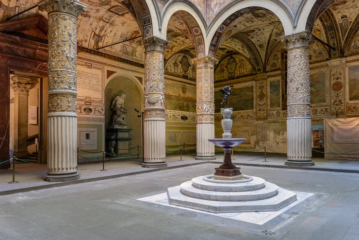 The inspiration behind Velluto Bianco can be traced back to the heart of Florence, to a palazzo where the Renaissance itself found form in stone. This candle’s ribbed, sculpted silhouette echoes the columns of the Palazzo Vecchio, a fortress-palace that has stood for over 700 years in the very centre of Florentine civic life. Inside its quiet courtyard — pictured here — stand majestic pillars carved with scrolls, vines, and vertical fluting. Built in the 13th century and transformed during the 1500s under the rule of Duke Cosimo I de’ Medici, the palazzo became a symbol of power, beauty, and artistic rebirth. The fluted columns were not just structural; they were intentional. Their repeating grooves, reaching upward like carved fabric, created rhythm and harmony — a balance between function and grace. This balance is what inspired the Velluto collection. With Velluto Bianco, we’ve brought a quiet echo of that world into modern interiors — capturing the softness of light against stone, the elegance of sculpted lines, and the historical calm found in the spaces where art and architecture meet. Made for homes that appreciate heritage as much as beauty, it invites you to light a candle… and step, for a moment, into Florence.