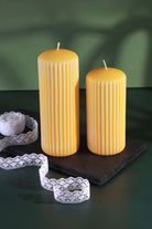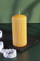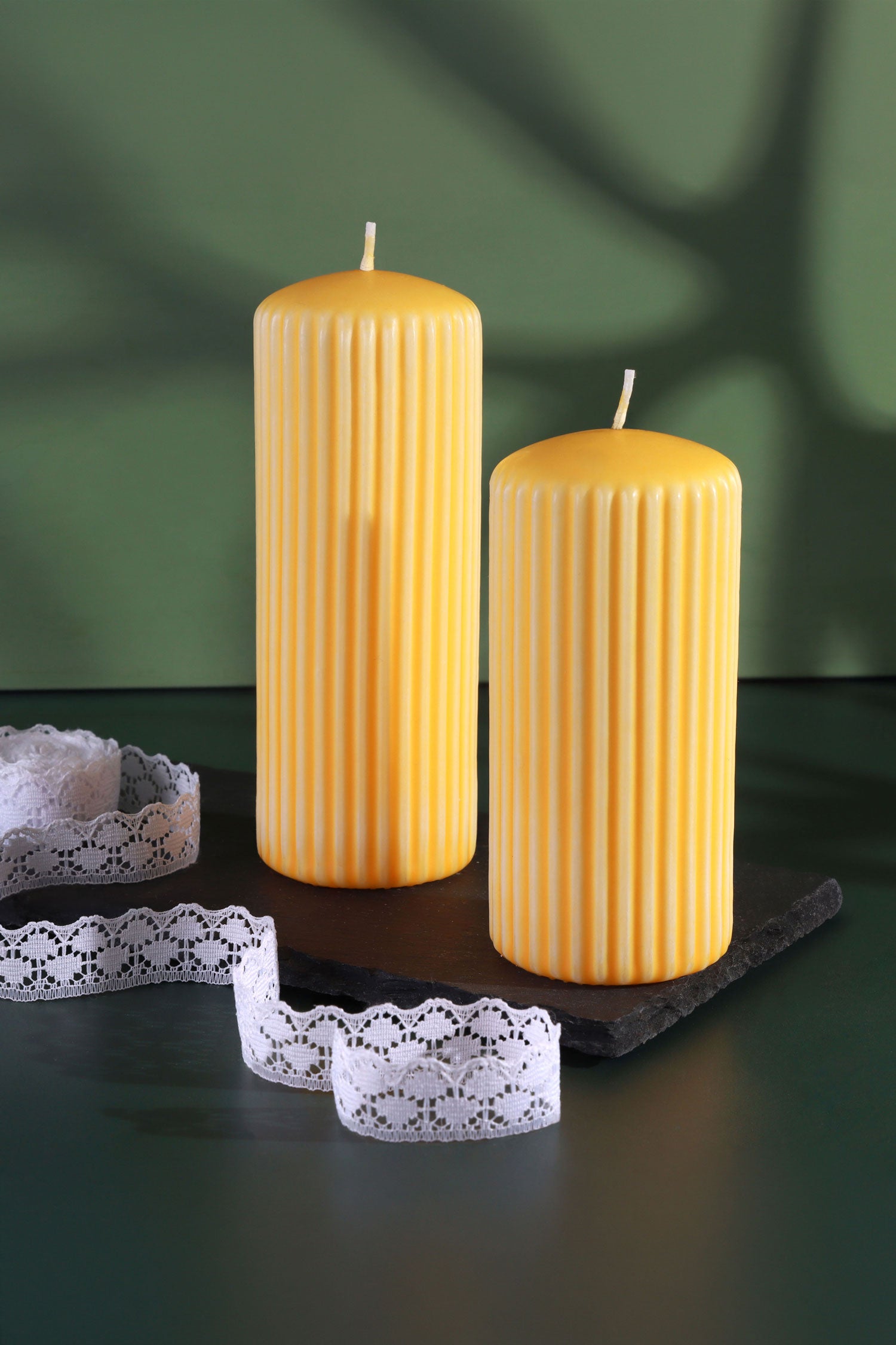 Velluto Sculpted Daffodil Yellow Ribbed Pillar Candle in a Velvet Matte Finish