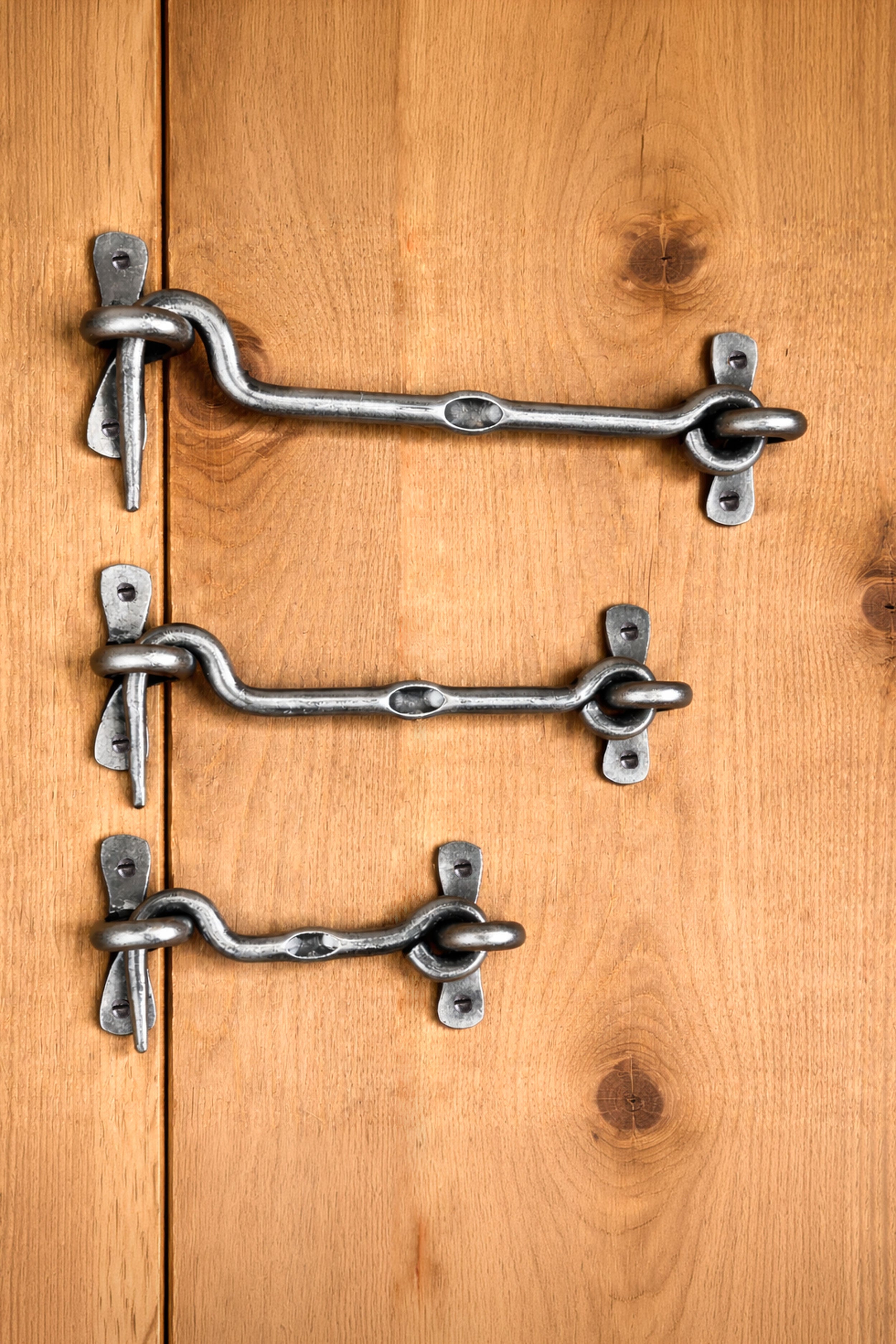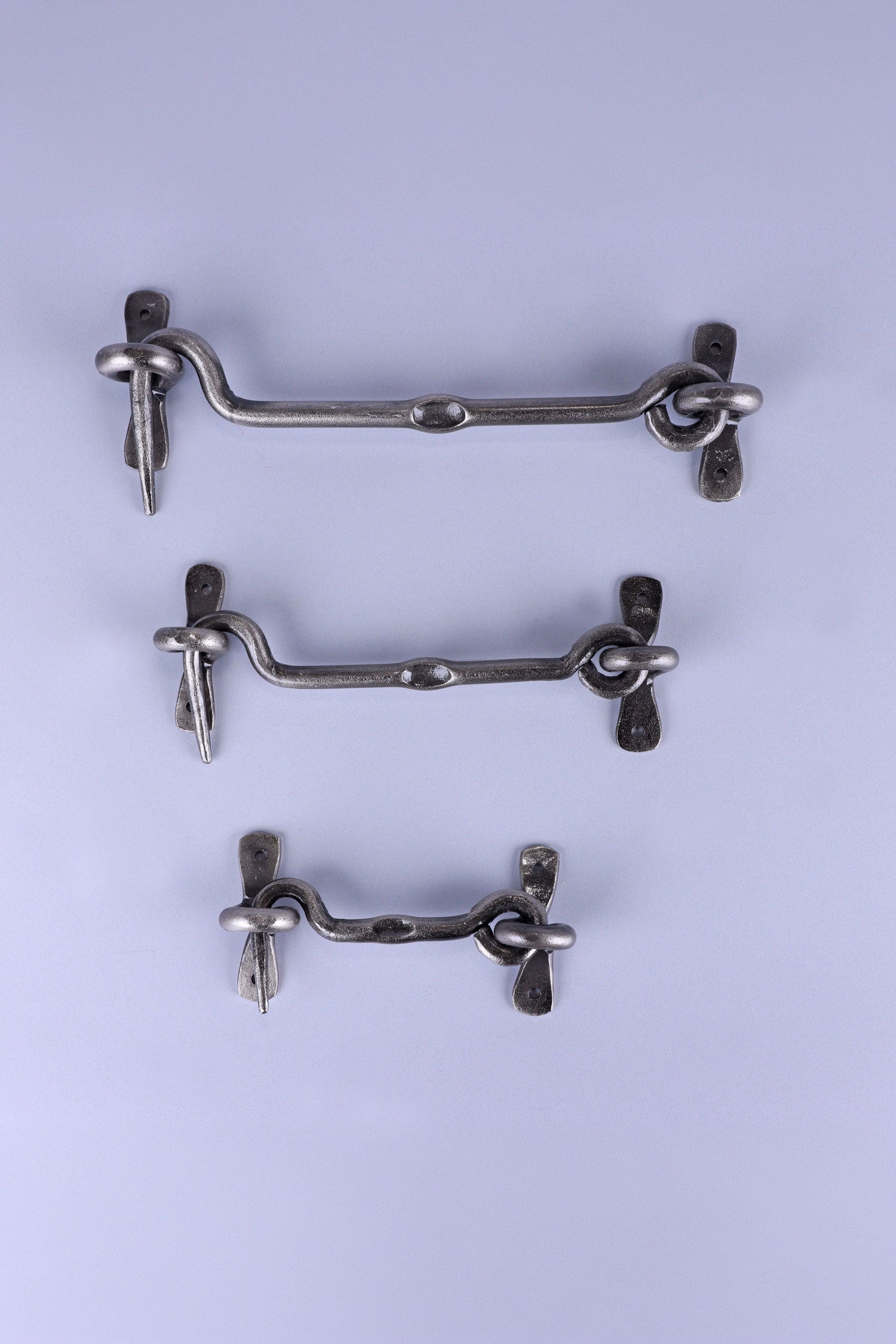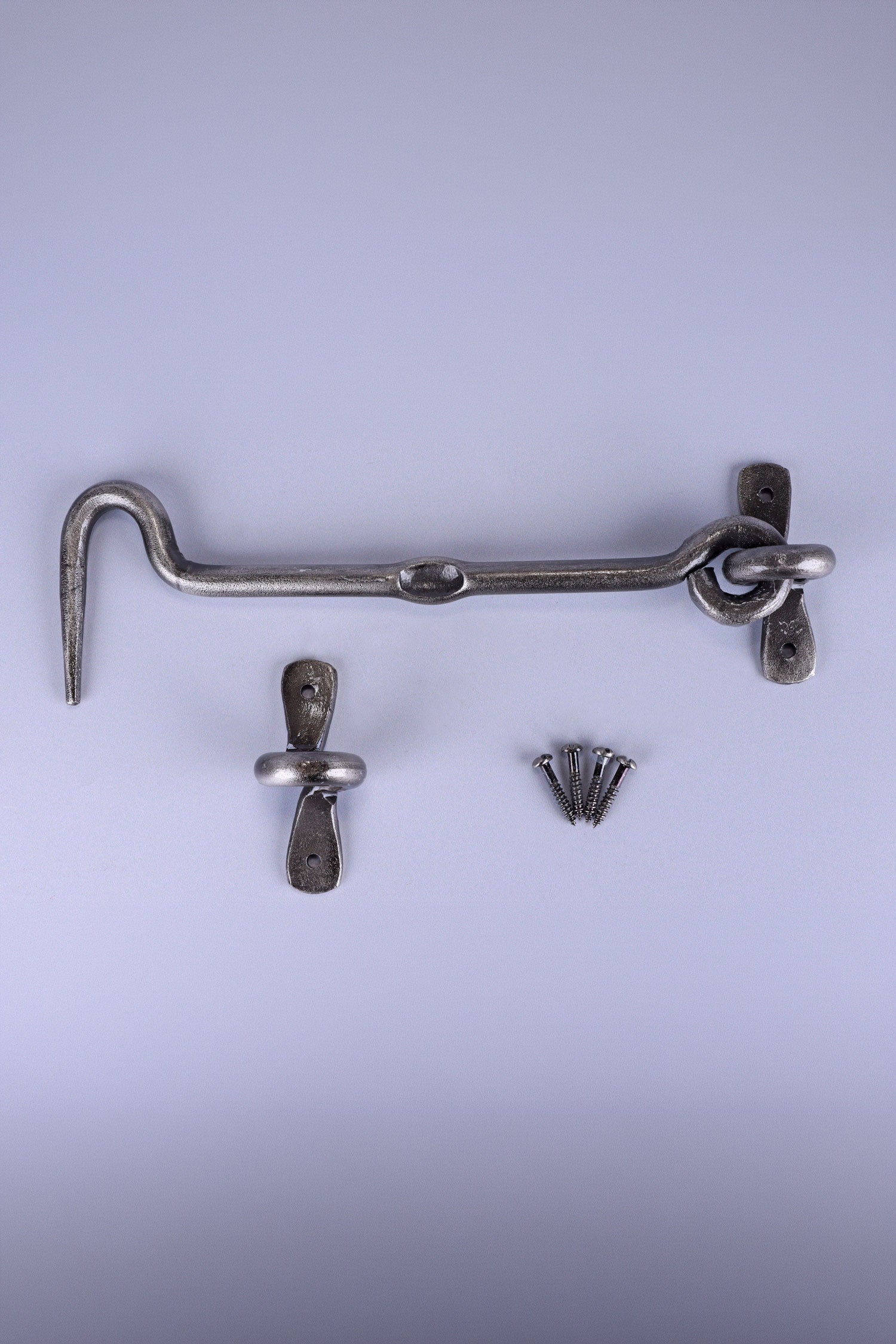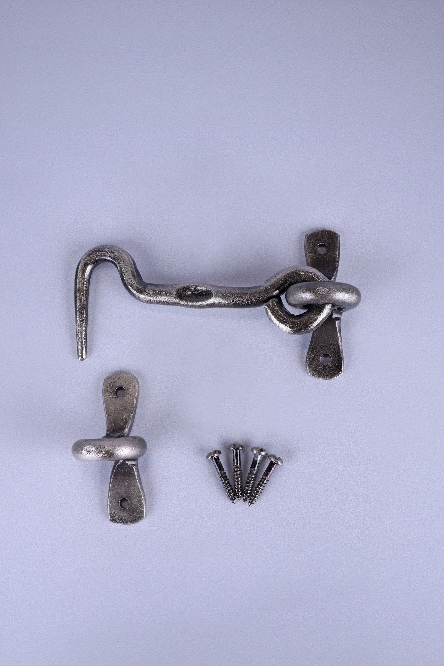 This traditional forged hook and eye door latch provides a simple and reliable way to secure doors while adding a touch of classic iron hardware to the space. The curved hook and forged eye create a practical fastening that reflects traditional blacksmith craftsmanship and classic design. Finished in a pewter tone, the latch offers a soft, aged silver appearance that pairs beautifully with timber doors, painted panels, and other traditional fittings. The subtle metallic finish brings a balanced and understated character that suits both rustic and classic interiors. The hook and eye mechanism allows the door to be secured quickly and released easily when needed. Its straightforward design makes it suitable for interior doors, utility rooms, cupboards, and other indoor spaces where a simple and dependable fastening is required. Due to the nature of the pewter finish, this latch is recommended for indoor use. All screws included. The latch is designed for surface mounting and can be installed easily using the fixing holes provided on the mounting plates.