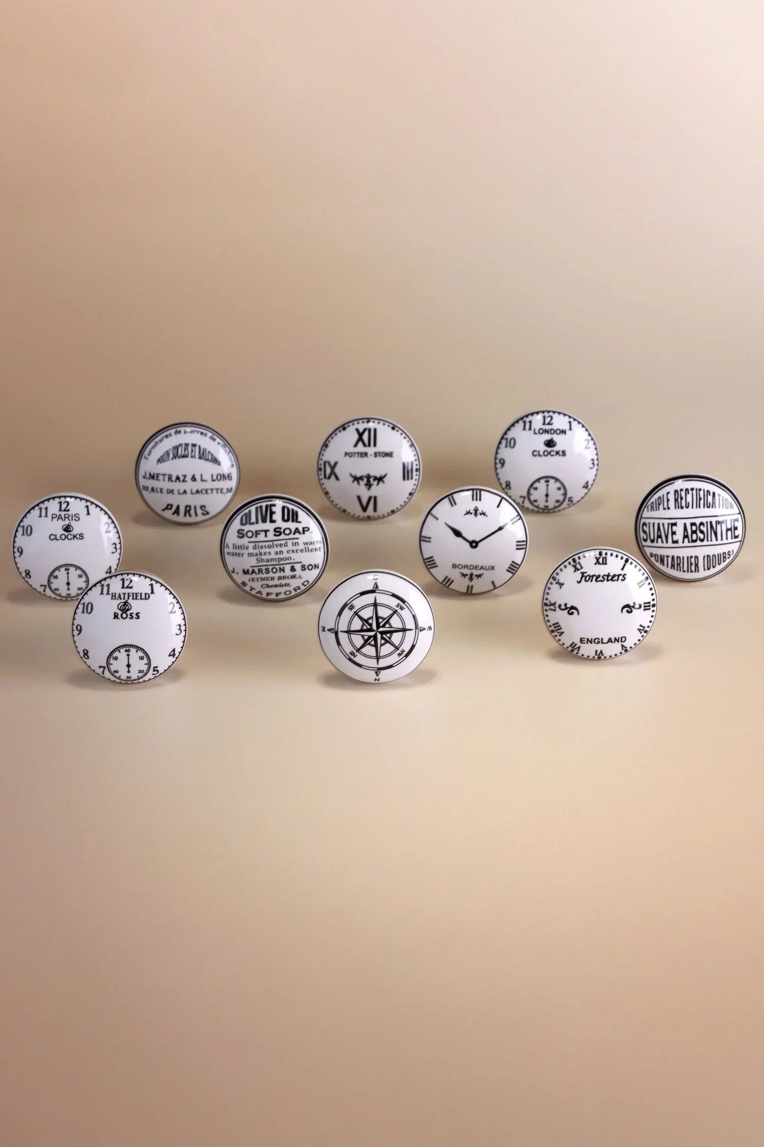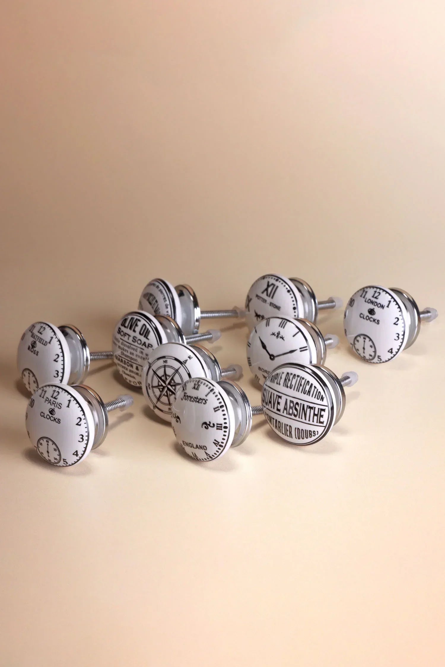 The Time Clockmaker Collection draws inspiration from traditional European clock faces, antique typography and the quiet precision of old-world workshops. Each ceramic knob carries its own distinct design — from Roman numerals and classic dial markings to vintage apothecary labels and continental print details — creating a curated set that feels collected over time. The black and white palette gives the collection clarity and structure, allowing the intricate line work and historic references to stand out with confidence. There is something historical about these designs — familiar yet enduring — resembling railway stations, Parisian streets, London clockmakers and the handcrafted industry era. Each knob is shaped from ceramic and finished with polished chrome fittings, bringing a clean, balanced contrast to the detailed faces. The rounded form sits comfortably in the hand, smooth and solid, offering both decorative character and practical strength. Installed across cupboards, wardrobes or interior doors, this coordinated set of ten transforms furniture into a statement of heritage and design. Used together, the varied clock and typography motifs create rhythm and personality. The Time Clockmaker Collection is about history in detail — a celebration of craft, precision and the enduring beauty of classic design.