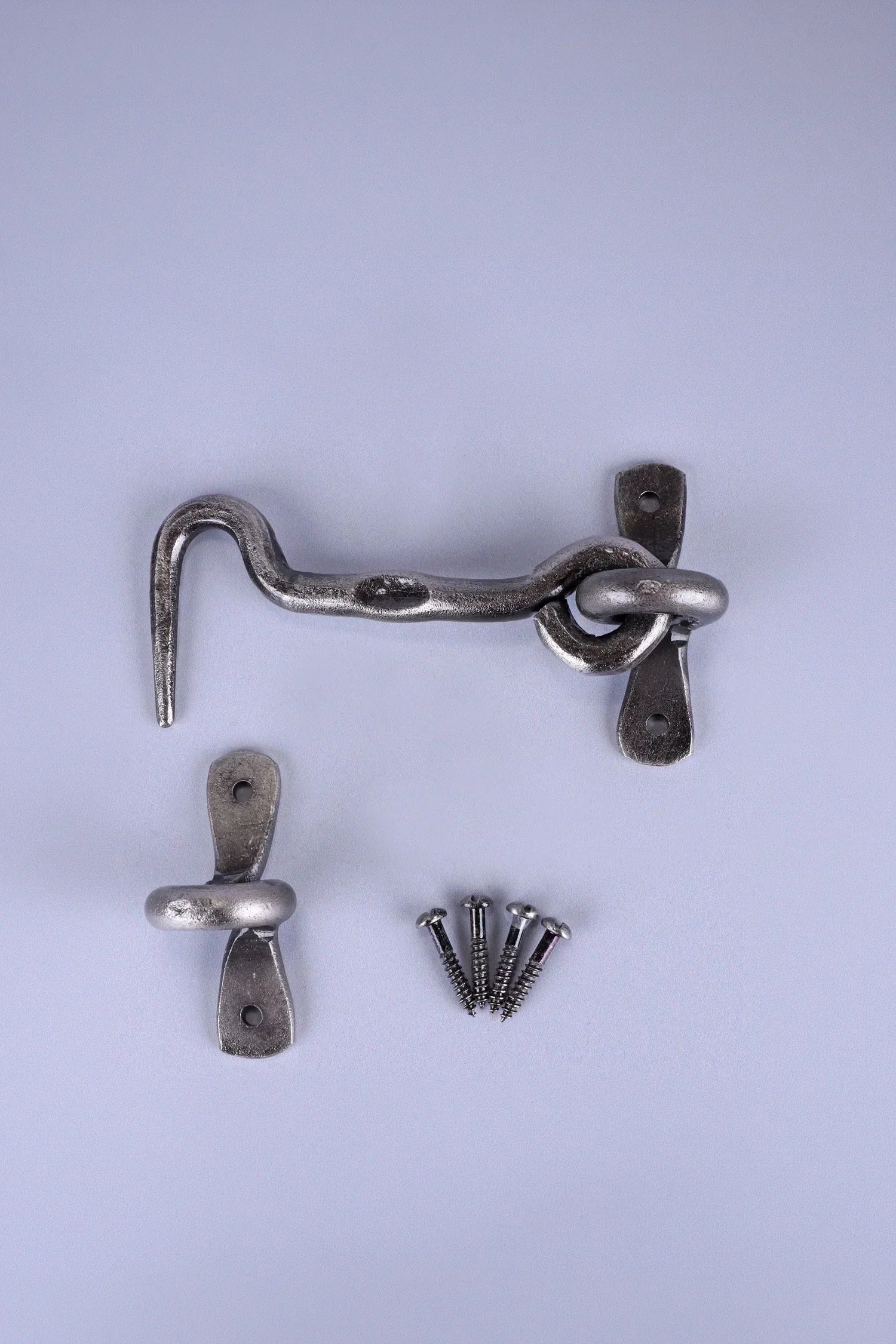 This traditional forged hook and eye door latch provides a simple and reliable way to secure doors while adding a touch of classic iron hardware to the space. The curved hook and forged eye create a practical fastening that reflects traditional blacksmith craftsmanship and classic design. Finished in a pewter tone, the latch offers a soft, aged silver appearance that pairs beautifully with timber doors, painted panels, and other traditional fittings. The subtle metallic finish brings a balanced and understated character that suits both rustic and classic interiors. The hook and eye mechanism allows the door to be secured quickly and released easily when needed. Its straightforward design makes it suitable for interior doors, utility rooms, cupboards, and other indoor spaces where a simple and dependable fastening is required. Due to the nature of the pewter finish, this latch is recommended for indoor use. All screws included.  The latch is designed for surface mounting and can be installed easily using the fixing holes provided on the mounting plates.