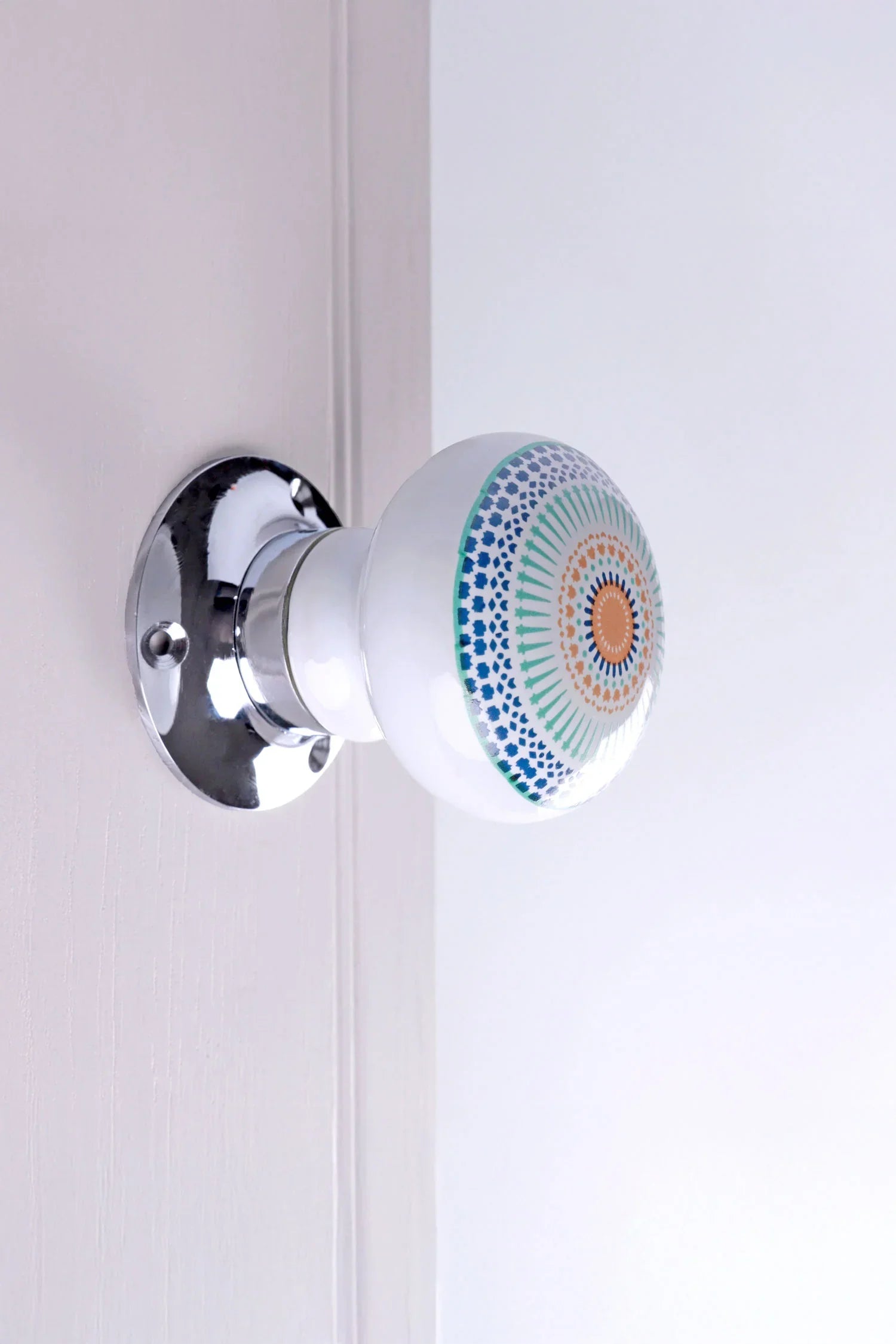 Crafted by hand with precision and care, the Positive Energy Radiance mortice door knobs reflect true artists' skill. Each piece is shaped in smooth ceramic, glazed for a lustrous finish, and topped with a delicately painted motif that captures light and movement. The polished chrome base offers a contemporary contrast, creating a functional yet refined statement for interior doors. The design is inspired by ancient symbolic patterns—forms once believed to channel optimism, balance, and a quiet joy into everyday life. With its radiant floral burst, the motif hints at sun and spirit, drawing from cultures long past and unnamed. The symbolism is subtle, never overt; instead, it invites a sense of positivity that gently settles into the atmosphere. It’s an object not of promises, but of quiet presence—made to be felt, believed in, and lived with. While deeply decorative in spirit, this set is constructed for daily functionality. Included are two turning ceramic knobs—one for each side of a single internal door—along with a solid 8 mm steel spindle and a complete set of fixing screws. Designed to operate through a traditional mortice turning system, these knobs connect firmly through the door, providing a stable, responsive turn that feels secure and satisfying. This through-door mechanism avoids the looseness or instability common in surface-mounted styles. Ideal for frequent-use doors within the home, the set suits spaces such as bedrooms, hallways, studies, and lounges, offering durability and elegance in equal measure. While this set does not come with a latch, most standard internal doors already have a compatible tubular mortice latch installed. In those cases, the Positive Energy Radiance knobs are ready to fit directly with the existing setup. The knobs are built around a secure through-bolt system, where both sides are joined tightly using bolts that pass through the door, ensuring a firm and lasting fit. Each ceramic knob is fixed onto a supportive chrome base that enhances stability while offering a polished contrast. The softly rounded form is designed for a comfortable grip, making it easy to turn even with frequent use. These knobs are intended for interior doors with a thickness of 3.5 to 4.5 cm (35 mm to 45 mm) and are compatible with most solid wood, MDF, and engineered timber doors. Though designed with UK standards in mind, customers across Europe and the US have also installed them successfully. For European installations, door thickness and the 8 mm spindle compatibility should be confirmed before fitting. In the US, some light adaptation may be required, and installation may be smoother with the help of a skilled tradesperson or confident DIY user. The internal turning spindle system is not suitable for use on cupboards, drawers. Likewise, the set is not fitted with a privacy lock—if installing on a bathroom door, a separate lock or bolt mechanism will need to be sourced and installed alongside. Trusted by professional carpenters and locksmiths for their straightforward installation and secure fit, the Positive Energy Radiance knobs combine artisanal design with practical confidence, bringing symbolic beauty and reliable function into the heart of a home.